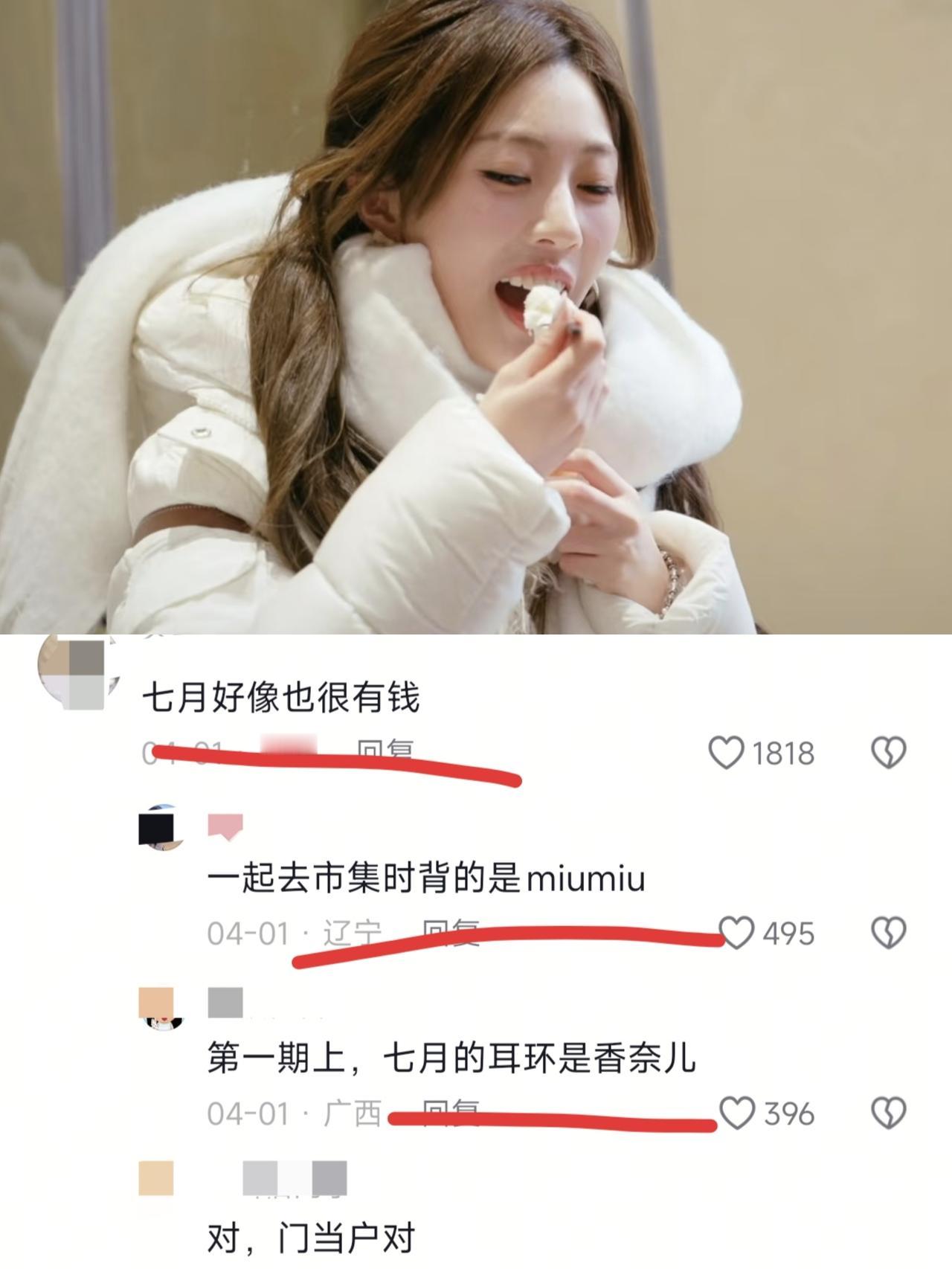 七月笑起来像祝绪丹,也有说像是《势均力敌2》的刘佳怡,还有网友说像是《心动7》的乐言,节目中奢侈品穿搭不断,第一期戴香奶奶耳环,和小轩一起去市集背了miumiu包包,参考价14000元。第一天用的自己的iPhone17手机。