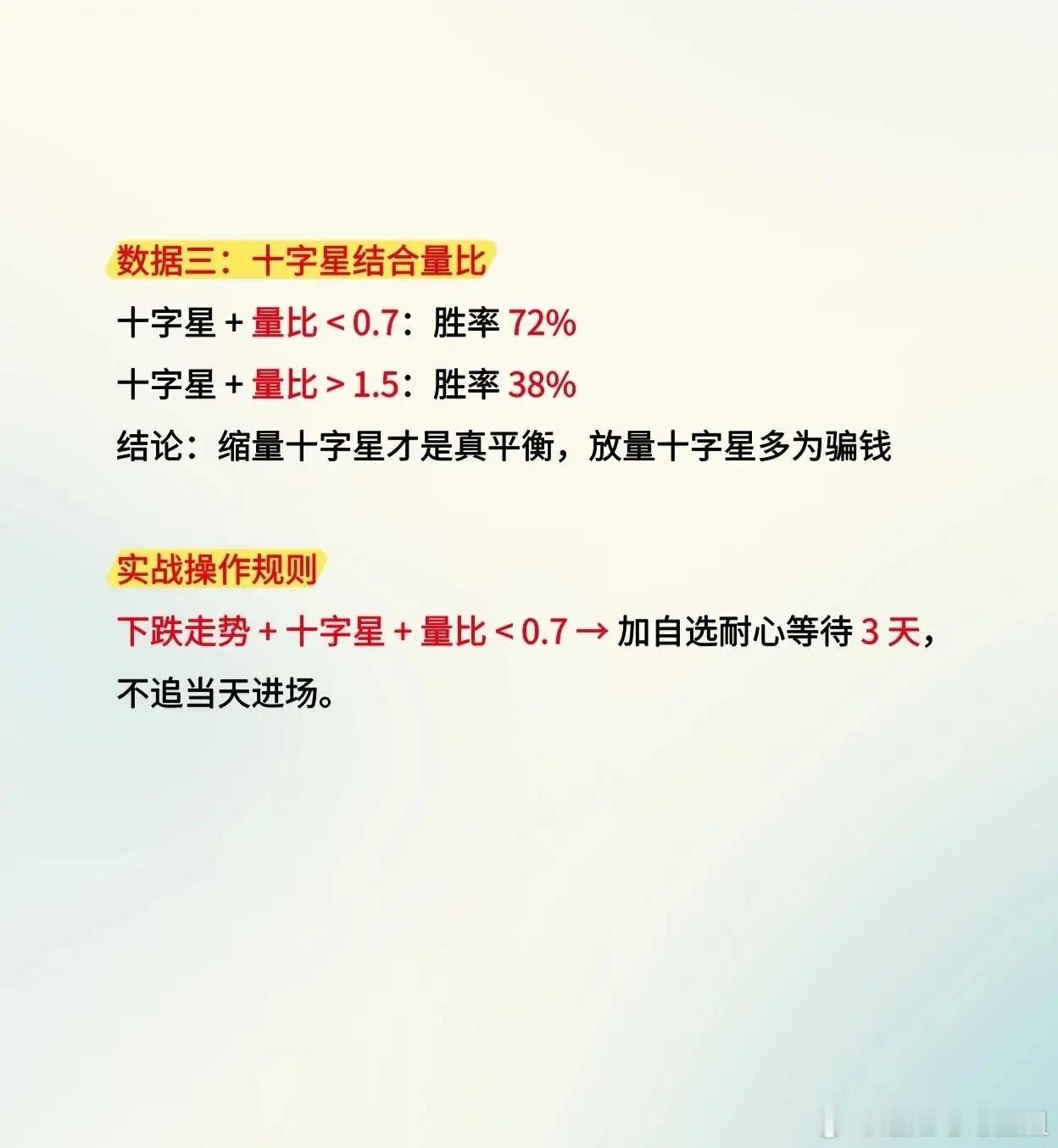 股市战法之十字星战法。炒股里,十字星可是个关键角色。十字星是收盘价和开盘价接近、上下影线长度相当的K线形态,反映价格趋势可能转折。战法结论——下跌走势➕十字星➕量比<0.7=选择等待三天(不追当天票)。记住“4个不买,2个不卖”很重要。下降段、整理阶段未明确信号、高位、高位放量的十字星不买;中位缩量、中位放量十字星次日回升不卖。比如下降段十字星,预示市场可能继续跌,急着抄底易被套。十字星背后藏着主力意图,可能是洗盘反转,也可能是出货诱多。吃透它的盘口逻辑,不用复杂指标,就能精准踩准买卖点。