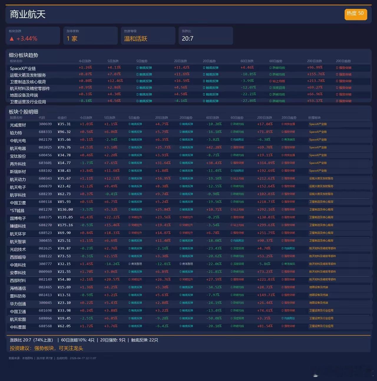 到顶了吗?光通信板块 Vs 商业航天板块,要考虑切换不?光通信板块到顶了吗?今天光模块龙头的表现还是不错的,同时大摩又把目标价给提了一把;这样子整个板块的空间又继续拉升了。光模块龙头能维持住(即使是震荡),板块就能继续向上;我在周三和周四两天已经将龙头置换为光产业链上游的标的,但光+PCB仍然是我的主力持仓。持续看好!同时我们也可以将投资划分为业绩类+题材类;光和PCB属于业绩类,商业航天可以算题材类。参考附图两组数据来比较下两者的强度:1、板块涨幅(使用的数据来源于我个人关注的个股):商业航天3.44%,光通信6.52%2、子板块涨幅:商业航天:200天53%到213%,60天4.16%-16.59%,5日4.1%-12.46%光通信:200天229%到645%,60天20.73%-50.51%,5日1.58-21.16%3、涨跌比:商业航天:20:7,涨停1家光通信:22:2,涨停6家光仍然强势,而且我认为随着扩产逻辑的演进,上游以及OCS概念会有非常多的机会。由于资金大量被光和PCB吸纳,商业航天没有像去年底那样全面普涨,但已经有值得关注的标的在起来了,逐步有一些趋势,可以选择重点去跟踪布局。提醒下无论是业绩股还是题材股,都要能承受波动。如果你希望出个类似的报告,可以点赞回复,把你关注的板块和个股给我一个列表,我可以协助出一个类似的报表,帮助你把握一段时间的趋势。