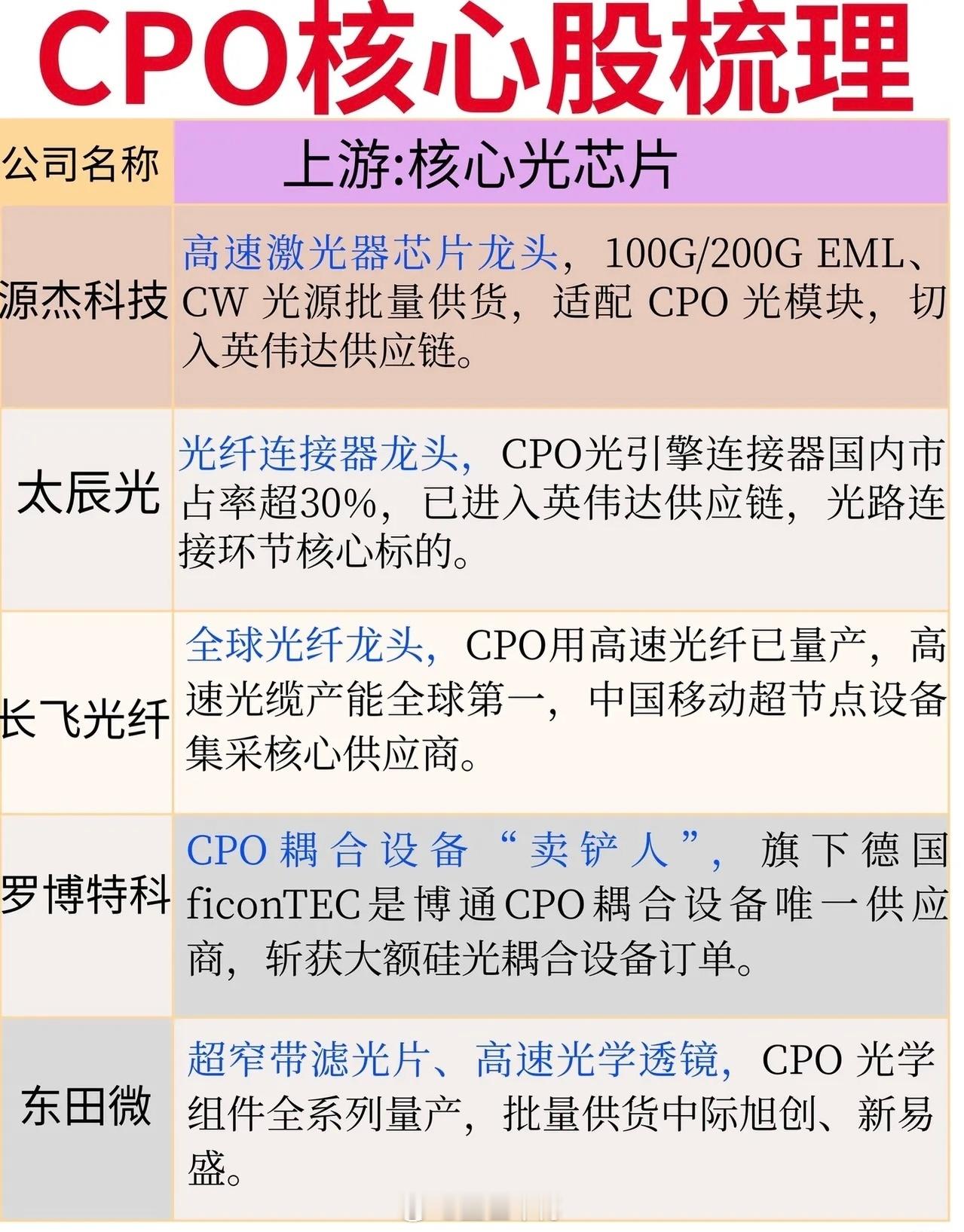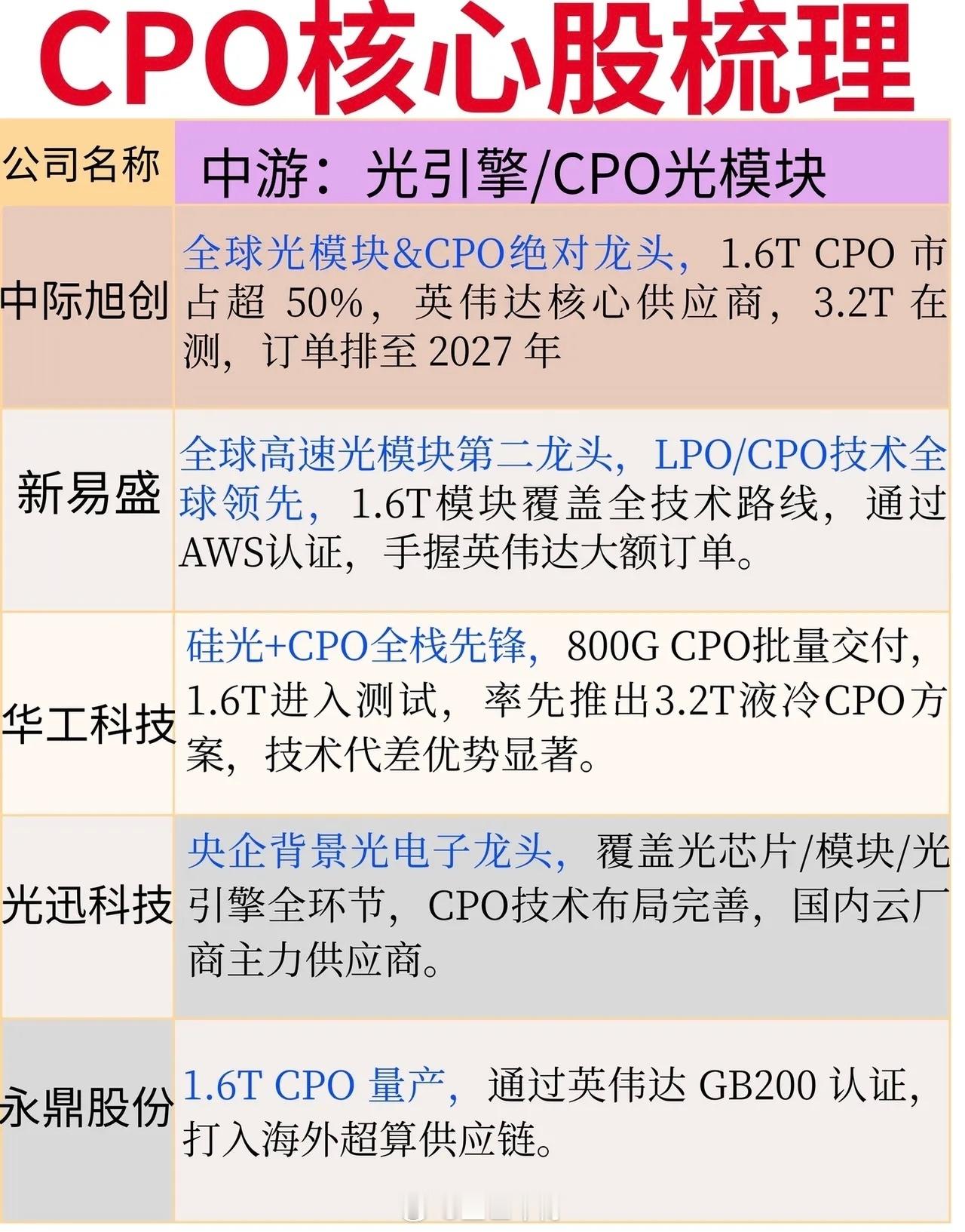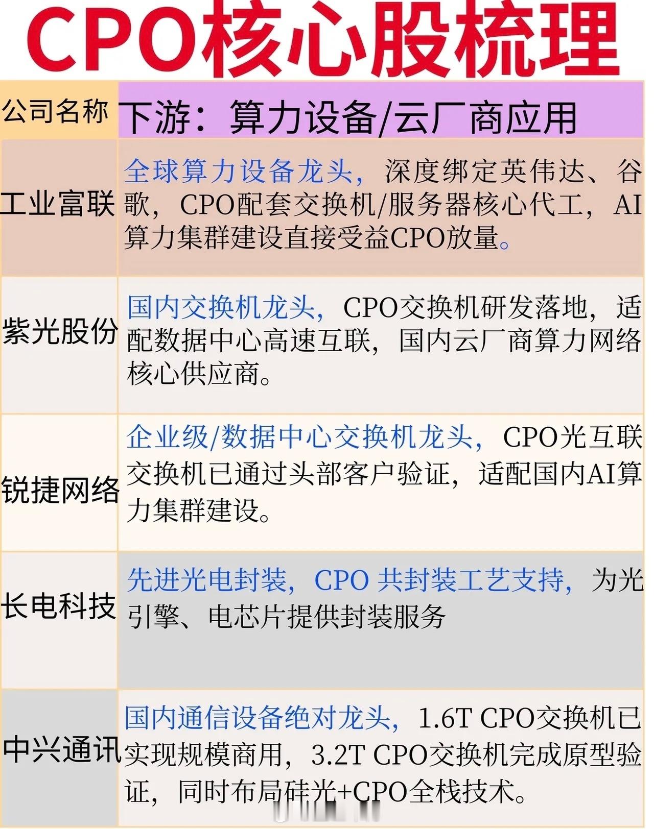 CPO赛道:AI算力互联的“高速公路”革命当AI大模型的算力需求呈指数级爆发,传统电互联已成为性能瓶颈,CPO(共封装光学)技术正成为打通算力集群“最后一公里”的关键。近期,国内数据中心高速互联技术政策密集出台,叠加英伟达等巨头加速CPO商用落地,这条赛道迎来了技术与需求的双重共振。 🔍 赛道核心逻辑拆解CPO的本质,是将光引擎与交换机芯片直接封装,通过缩短电信号传输距离,实现带宽提升与功耗下降,解决800G/1.6T时代的互联瓶颈。相比传统光模块,CPO可降低功耗30%以上,是支撑AI算力集群高效运行的“高速公路”,市场空间随AI算力需求扩张持续爆发。🏭 产业链核心环节梳理1. 上游核心光芯片:技术攻坚的“卡脖子”环节天孚通信、仕佳光子是CPO光引擎与波分芯片的核心供应商,三环集团、胜宏科技提供陶瓷基板与高速PCB,光库科技、源杰科技在调制器与激光器芯片领域实现突破,核心壁垒在于微耦合工艺与良率控制,成长空间随CPO渗透率提升持续打开。2. 中游光引擎/CPO光模块:赛道竞争的主战场中际旭创、新易盛是全球CPO光模块龙头,1.6T产品市占率领先,华工科技、光迅科技在液冷CPO方案上形成差异化优势,核心壁垒在于技术路线迭代与巨头客户认证,订单排期已延伸至2027年,成长空间确定性极强。3. 下游算力设备/云厂商应用:需求落地的关键场景工业富联、中兴通讯为CPO交换机与服务器提供代工支持,紫光股份、锐捷网络推出适配CPO的高速交换机,核心壁垒在于设备集成能力与客户资源,直接受益于AI算力集群的大规模建设。 ⚠️ 行业趋势与风险提示当前CPO赛道呈现三大趋势:1.6T产品进入规模化商用,液冷CPO方案成为主流方向,硅光与CPO技术融合加速推进。但需警惕风险:技术迭代速度快,部分厂商可能面临路线错配风险;客户认证周期长,量产进度不及预期;海外巨头专利壁垒较高,国产替代进程存在不确定性。CPO赛道的竞争,本质是光芯片、封装工艺与客户资源的综合比拼。在AI算力互联需求的驱动下,具备全链条技术优势与巨头绑定能力的企业,将在这场算力互联革命中抢占先机。股市有风险,投资需谨慎。
