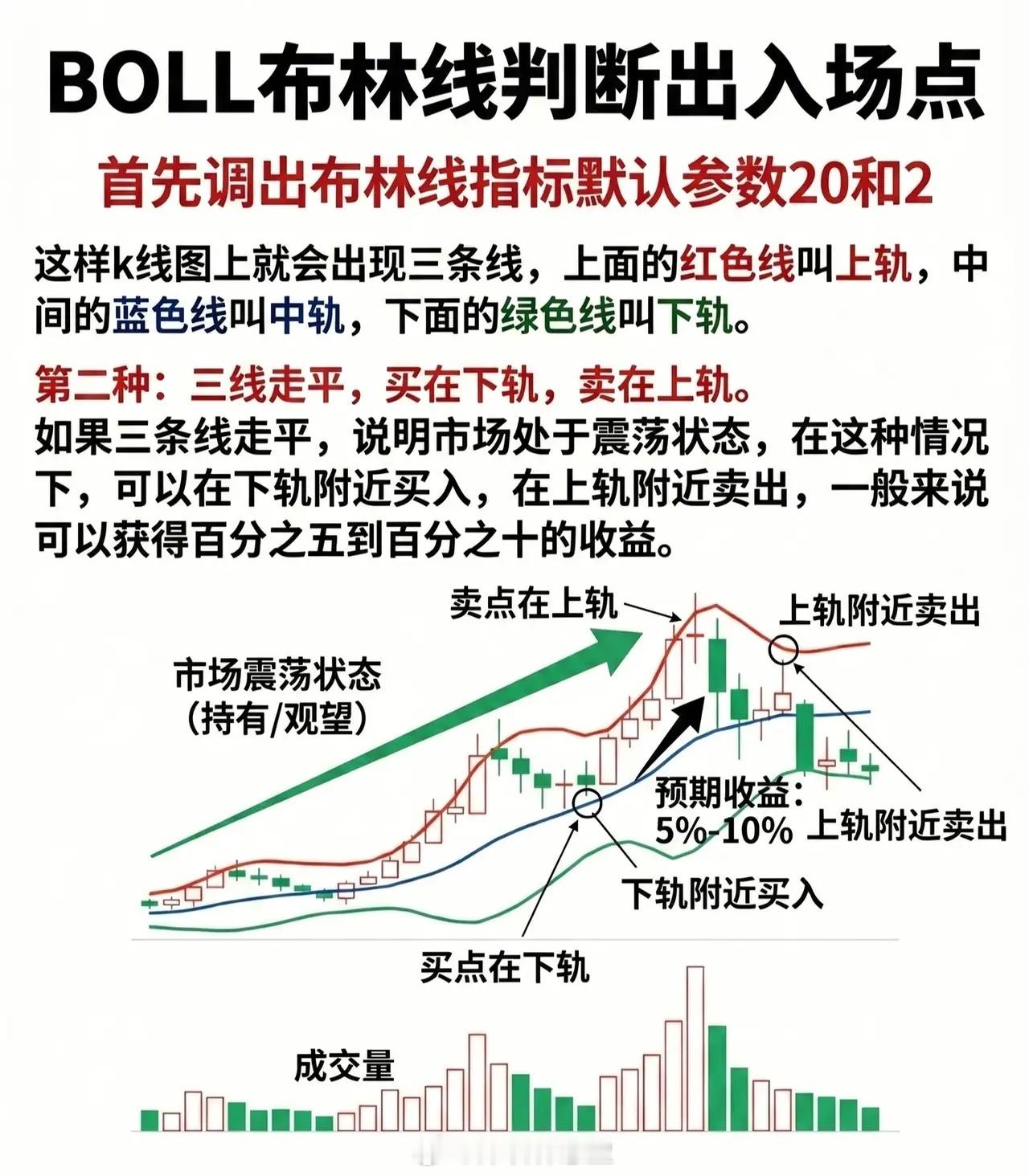 - 特征:上轨、中轨、下轨横向走平,说明市场处于横盘震荡状态,多空力量暂时平衡。- 策略:「买在下轨,卖在上轨」,适合波段操作。震荡行情中,下轨是支撑买点(价格回踩下轨后易反弹),上轨是压力卖点(价格触碰上轨后易回落)。一般可获取5%-10%的波段收益。