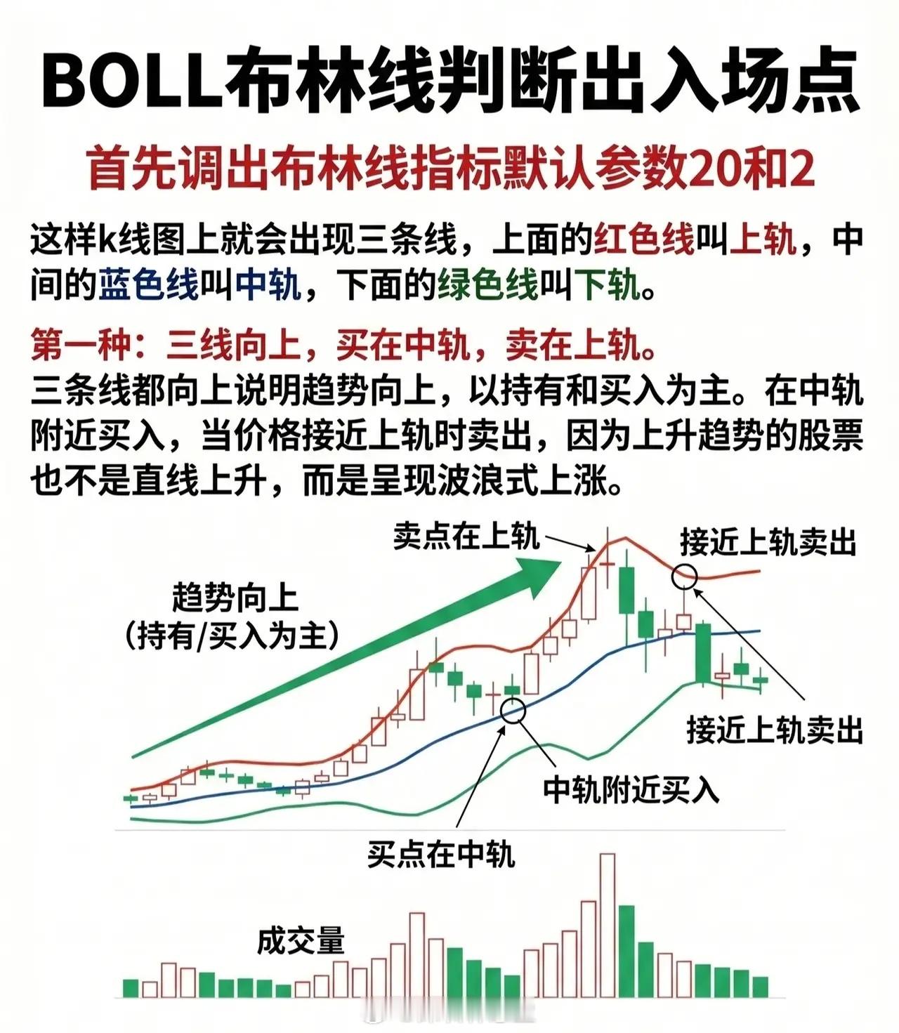 - 特征:上轨、中轨、下轨同步向上发散,表明市场呈上升趋势。- 策略:以“持有/买入”为主,遵循「买在中轨,卖在上轨」。上升趋势中股价多为“波浪式上涨”,而非直线拉升。因此,中轨附近是低吸买点(支撑有效);当价格接近上轨时卖出(压力位遇阻回落概率高)。