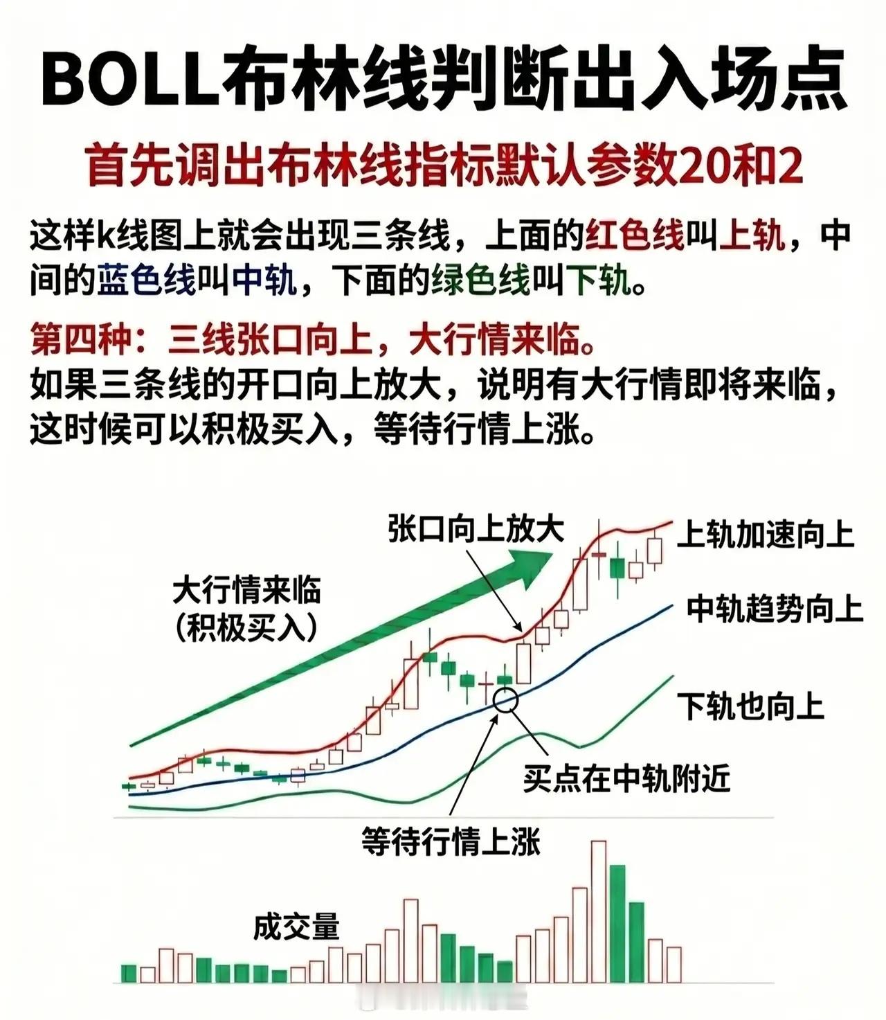 - 特征:上轨、中轨、下轨的开口(上下轨间距)向上放大,且中轨趋势向上,表明大级别上涨行情即将来临。- 策略:「积极买入,等待行情上涨」,买点参考中轨附近。开口放大+中轨向上,是趋势强化的信号(多头力量加速积累),此时介入有望捕捉主升浪。
