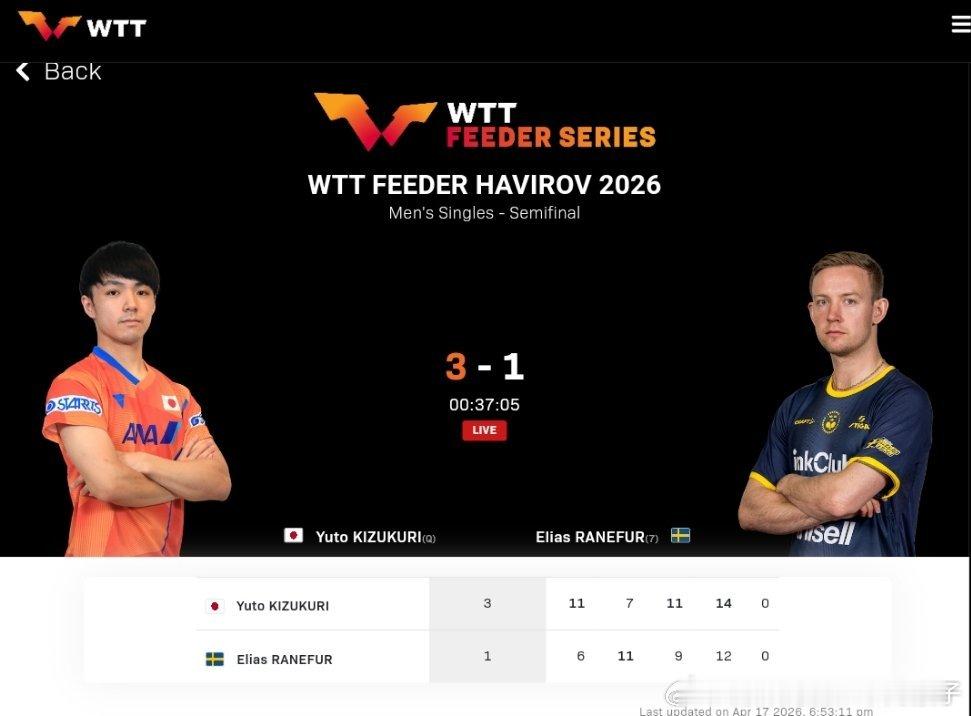 木造勇人3比1拉内福尔(6,-7,9,12)科祖尔3比2力廉巴德(-4,-9,5,4,3)晋级2026WTT哈维诺夫支线赛男单决赛决赛:木造勇人🇯🇵VS科祖尔🇸🇮