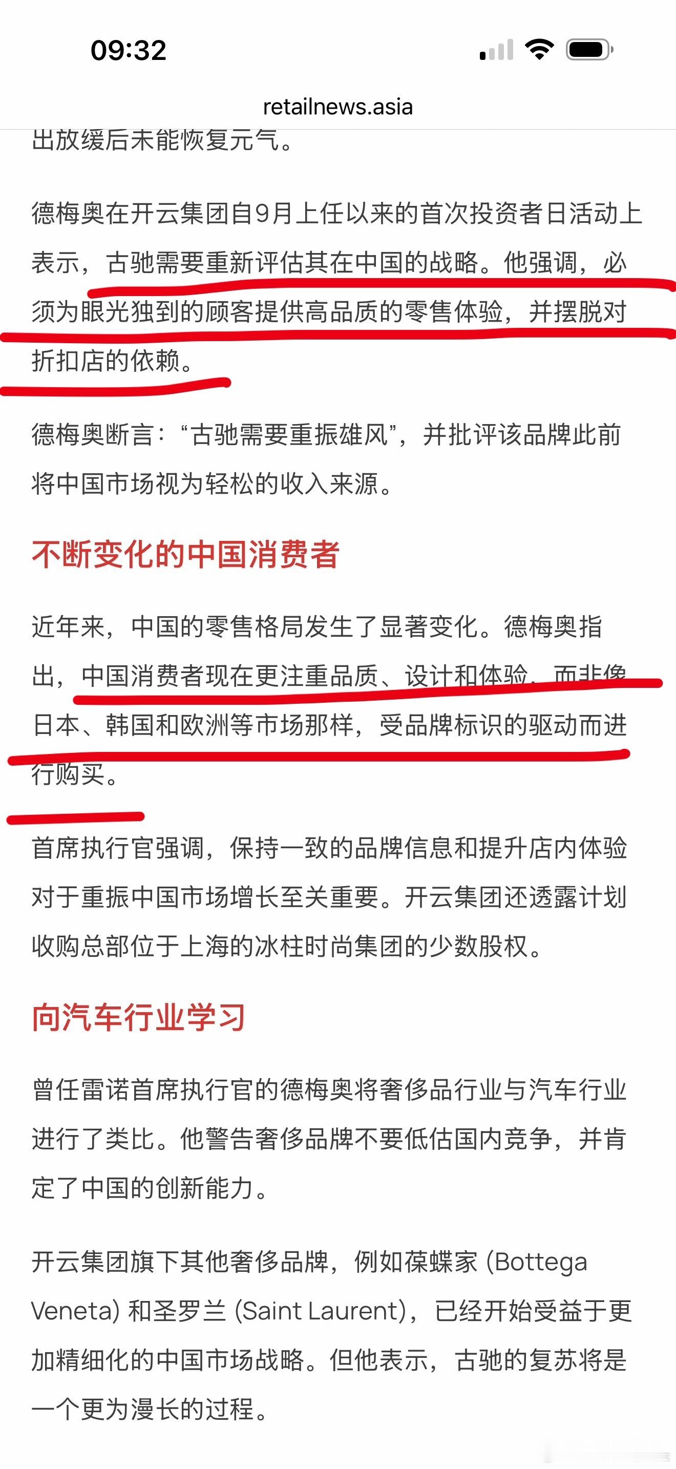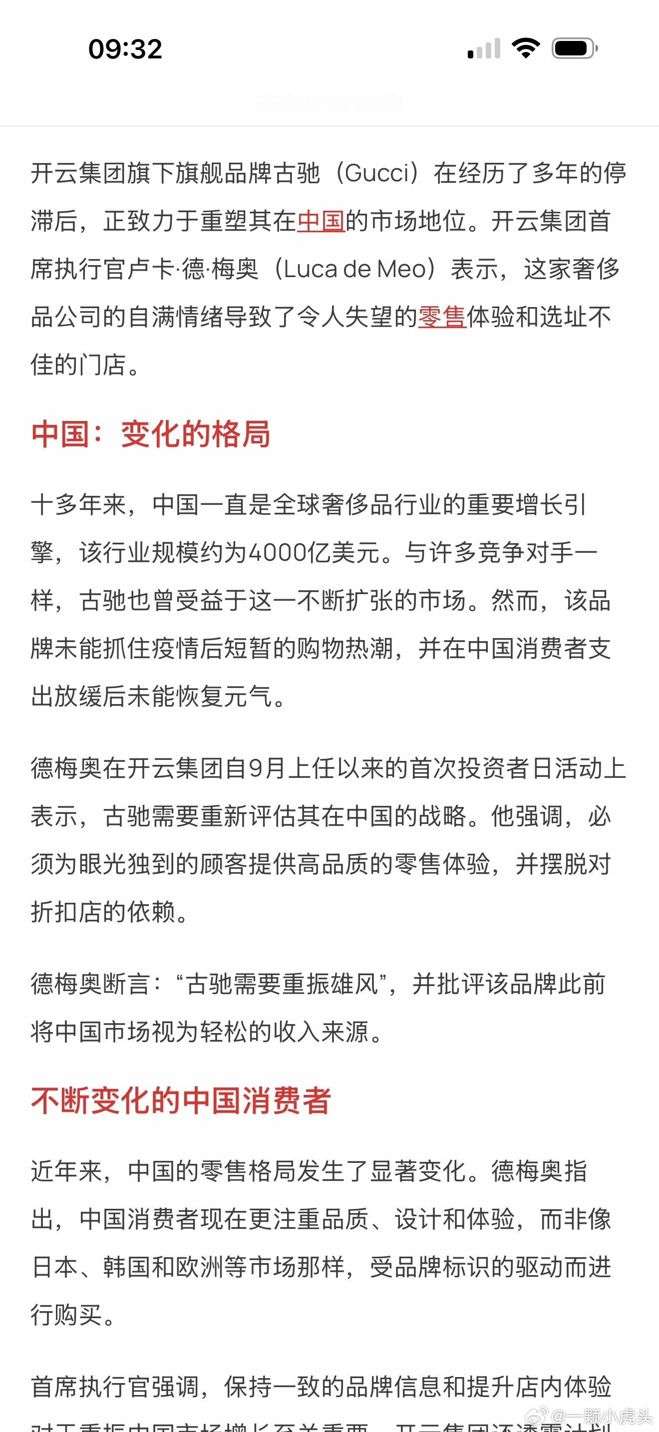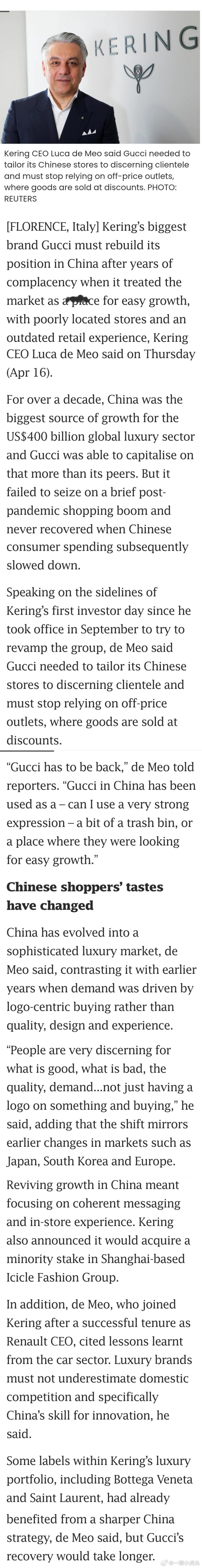 好恶毒的商战啊!人家总裁不是那个意思找了原采访,人家的意思是说以前过度依赖(折扣店模式)他在批评自己公司的这个运营模式而已。而且他采访里非常肯定中国市场对于古驰的重要性,直言中国消费者不支出Gucci就一蹶不振!GUCCI总裁本意是说要更加重视中国市场,要迎合中国消费者看重品质设计和体验的需求!GUCCI其实是那么多奢侈品里面最亲中的,别的不说 开云集团在2013年买下圆明园的鼠首、兔首无偿捐赠给我们,这在奢牌里是绝无仅有的存在了吧。Gucci不能再把中国市场当垃圾桶