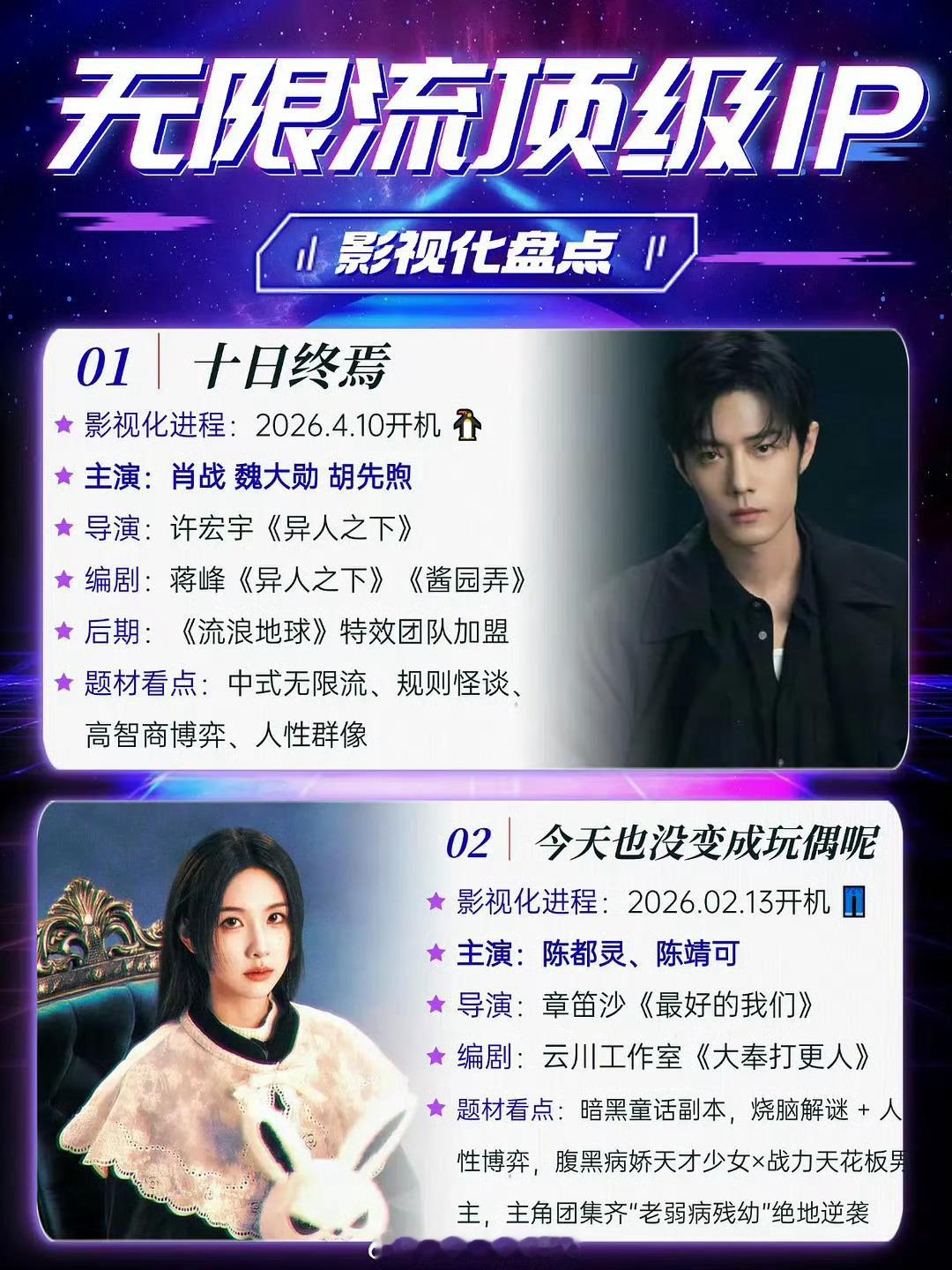 无限流顶级IP待播剧一览《十日终焉》主演:肖战《今天也没变成玩偶呢》主演:陈都灵、陈靖可《明日乐园》主演:钟楚曦、尹昉《我们生活在南京》主演:张子枫、马嘉祺 ……无限流ip已经有这么多拍的了吗?!看上去哪个有爆相?