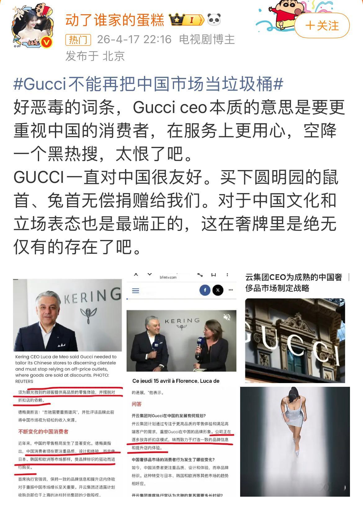 Gucci不能再把中国市场当垃圾桶好莫名其妙的标题党,uc小编来了都自愧不如,人家CEO哪里提了半个字垃圾桶,明明说的要取消折扣店,中国人比日韩更注重品质,而且Gucci一直立场都是稳稳的,这商战也是真毒啊