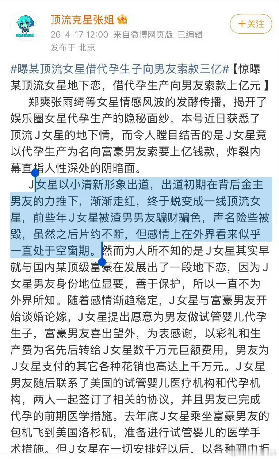 说有个顶流J女星以做试管婴儿代孕为由,先跟男友要3亿彩礼当保证金,人家准备好了她