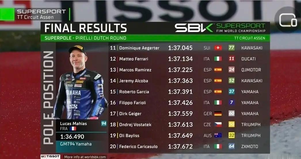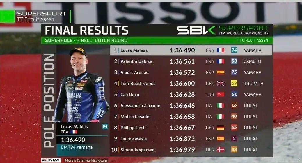 荷兰站摩托车排位赛今天刚刚结束,一场精彩对决在Assen赛道上演。