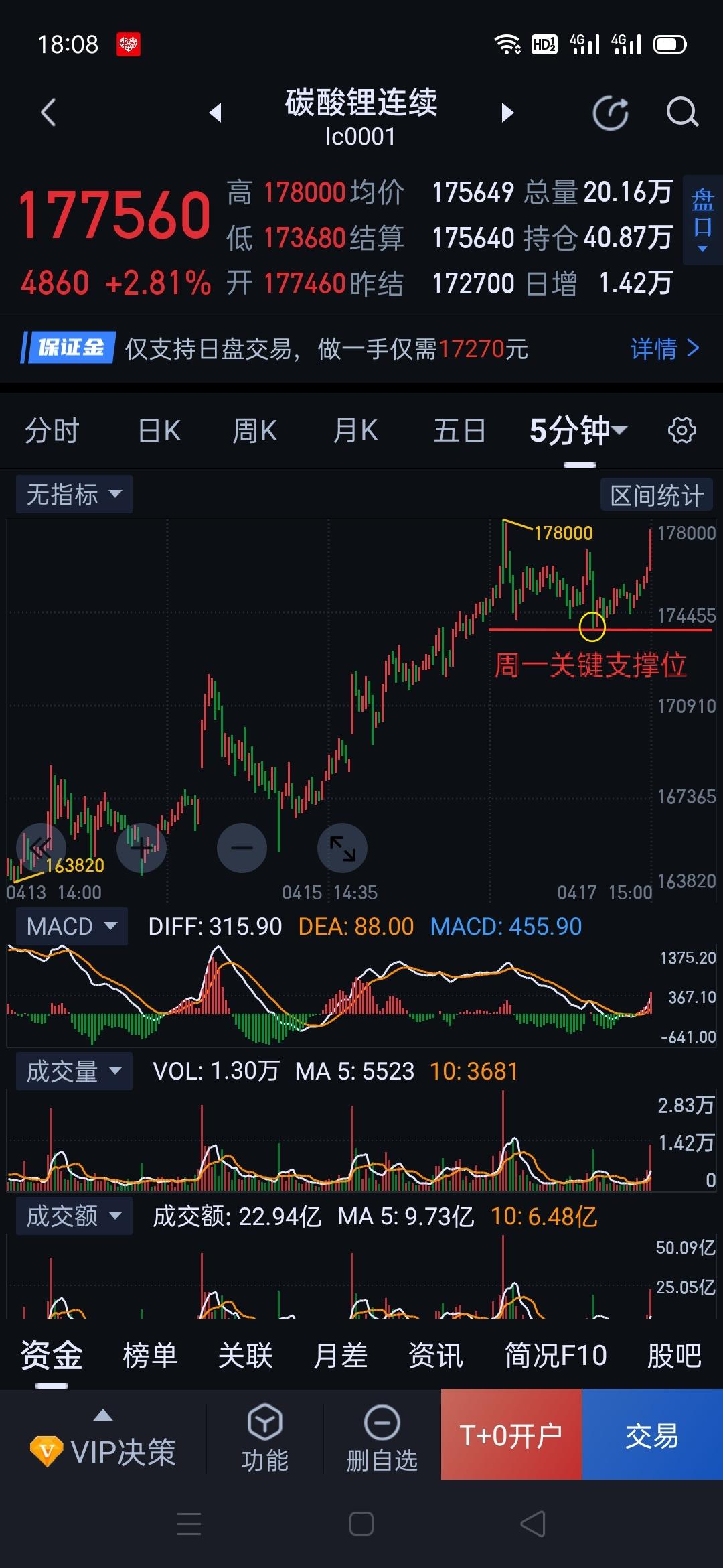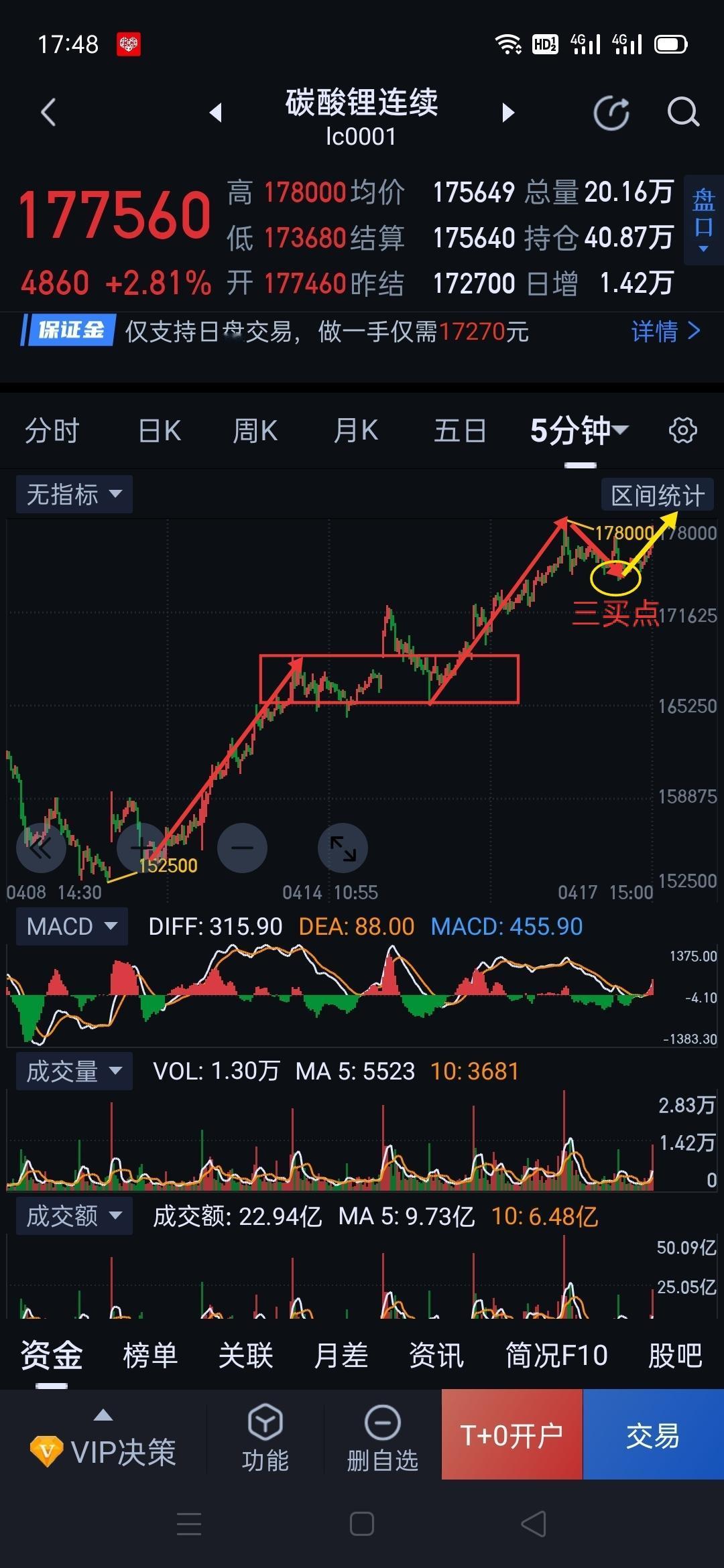 碳酸锂,下周将经历阶段性一致转分岐过程。 碳酸锂本周涨势如火如荼,多方在近期多重利好因素加持下,且歌且行。在临近前高之际,多空分歧将逐渐加大,下周还需谨慎应对。 碳酸锂,从152500开启的三十分钟一笔上,在次级别图(2)呈现的是一分钟中枢的三买结构。下周多方如砥砺前行,可期待形成一分钟级别的趋势性上涨。 细节上,周一能否有效站稳173680是关键(图3)。站稳,碳酸锂有望向(图1)前高发起冲锋。若不能站稳,将面临阶段性“多翻空”的过程。 碳酸锂,短期多头获利盘累积,要防止前高附近畏高情绪作祟,导致行情出现分岐。