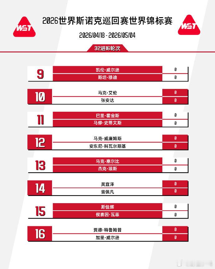 17:00 赵心童 vs 利亚姆·海菲尔德17:00 马克·艾伦 vs 张安达21:30 肖国栋 vs 周跃龙21:30 马克·威廉姆斯 vs 安东尼·科瓦尔斯基*次日2:00 赵心童 vs 利亚姆·海菲尔德次日2:00 巴里·霍金斯 vs 马修·史蒂文斯