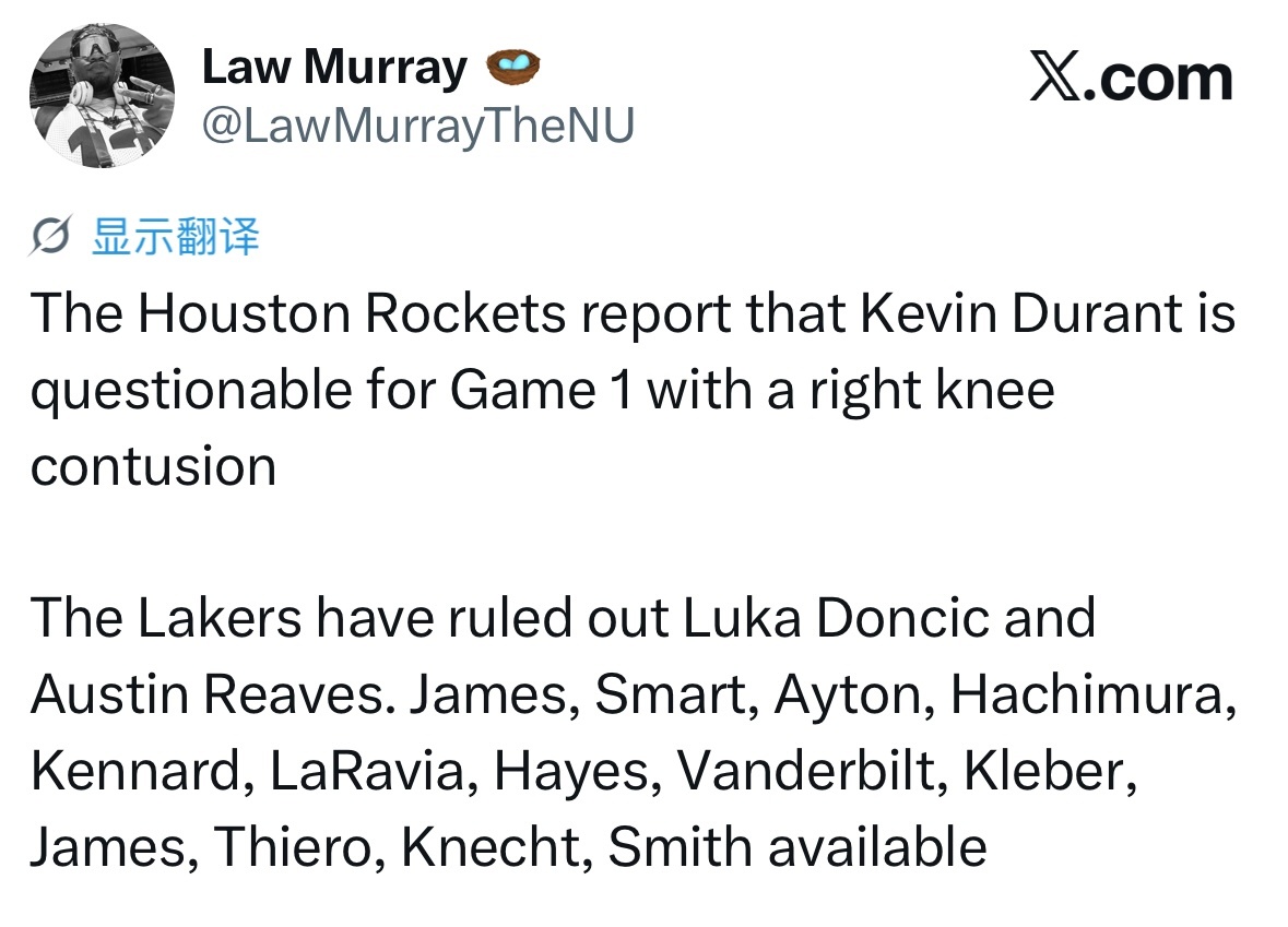 Game1,杜兰特因右膝挫伤,出战成疑。火箭vs湖人
