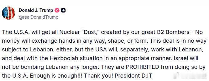 特朗普宣布与伊朗达成协议的概要,并命令以色列停止轰炸黎巴嫩。——美国将接收B-2轰炸机产生的所有核“尘埃”,不涉及任何金钱交易。——该协议不包括黎巴嫩,美国将单独处理真主党问题。——“以色列将不再轰炸黎巴嫩。美国已禁止他们这样做。”——“够了!”