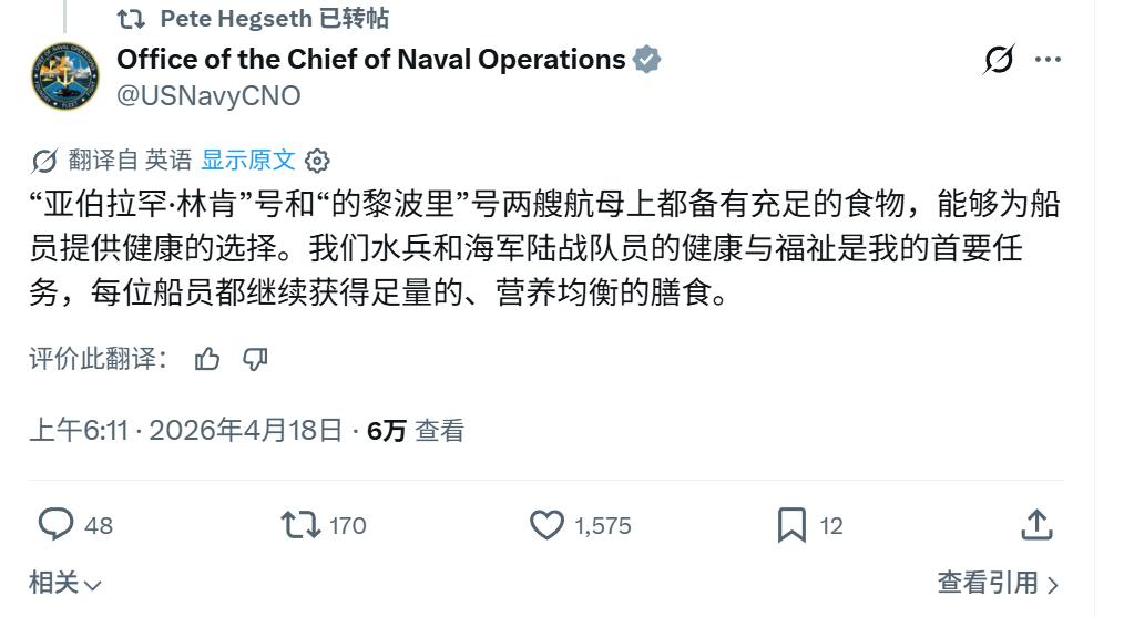 美国战争部长海格赛斯和美国海军作战部长办公室亲自下场辟谣“的黎波里”号和“林肯”号伙食很差,说那都是“假新闻”。但问题是你那餐盘里光秃秃的跟人造肉似的东西也是实打实拍出来的。