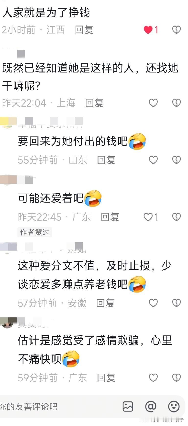 谈感情就谈感情,扯那么多金钱利益干嘛?被报复了心理就痛快了?也许就像人家说的,她是为了挣钱吧!一个贪财一个好色,没一个好东西[呲牙]