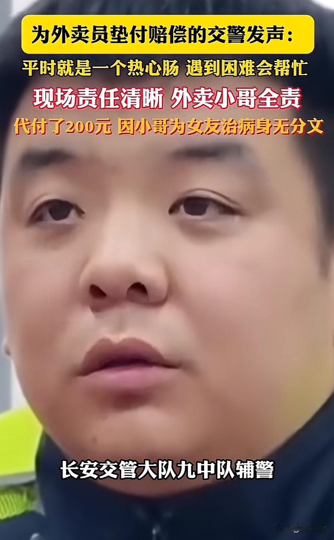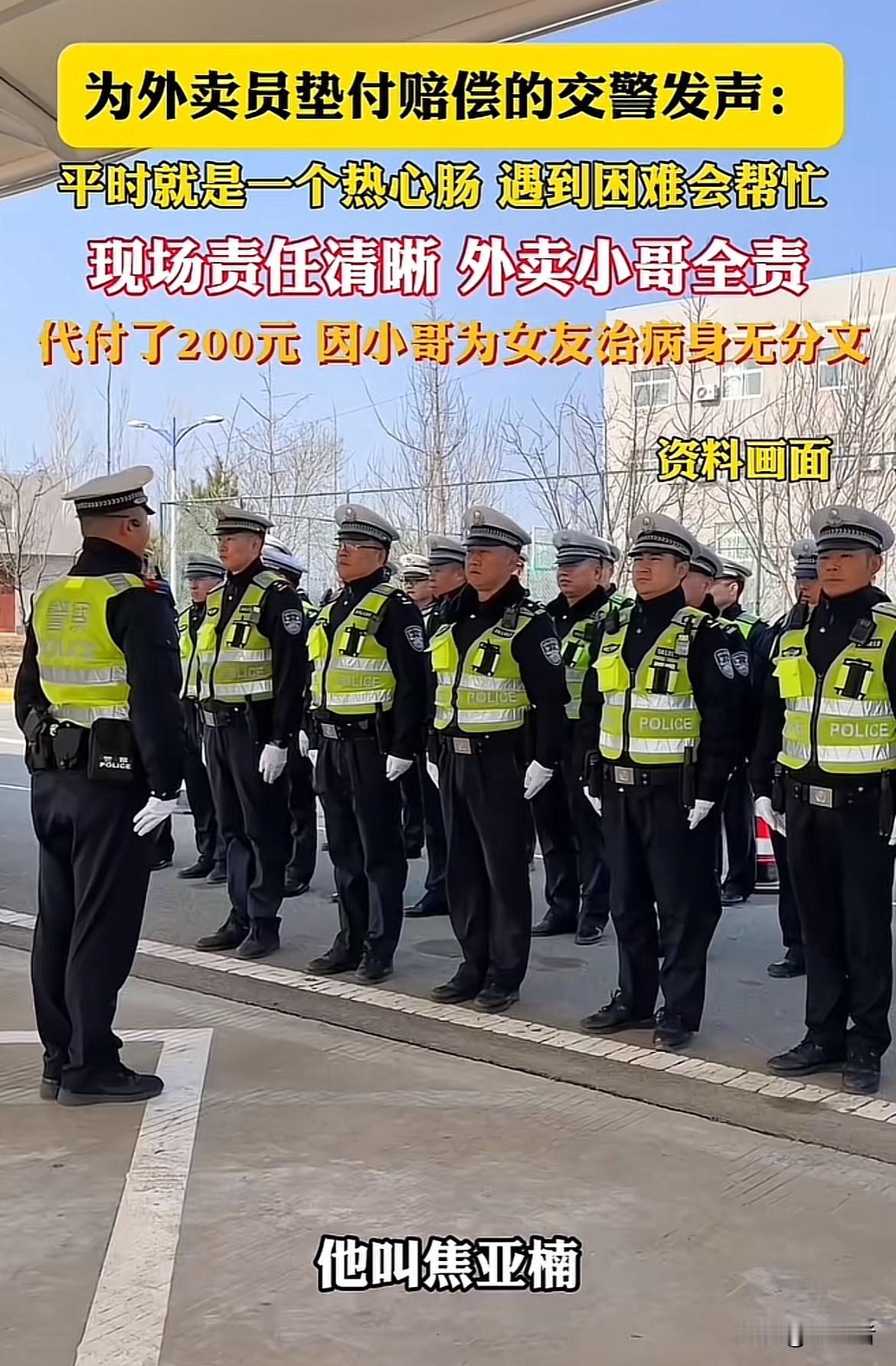 外卖小哥送餐时刮蹭82岁老人,被判全责后因钱都给患病女友治病,拿不出赔偿急得大哭。焦警官没有机械执法,而是与老人协商把赔偿从600元降到200元,还自掏腰包垫付,他说遇到困难能帮就帮。这事儿被曝光后全网刷屏,人民日报、光明网等主流媒体纷纷点赞,称赞他执法有力度更有温度中队长、大队长得知后还接力转款“报销”这就是社会温情的最好体现。