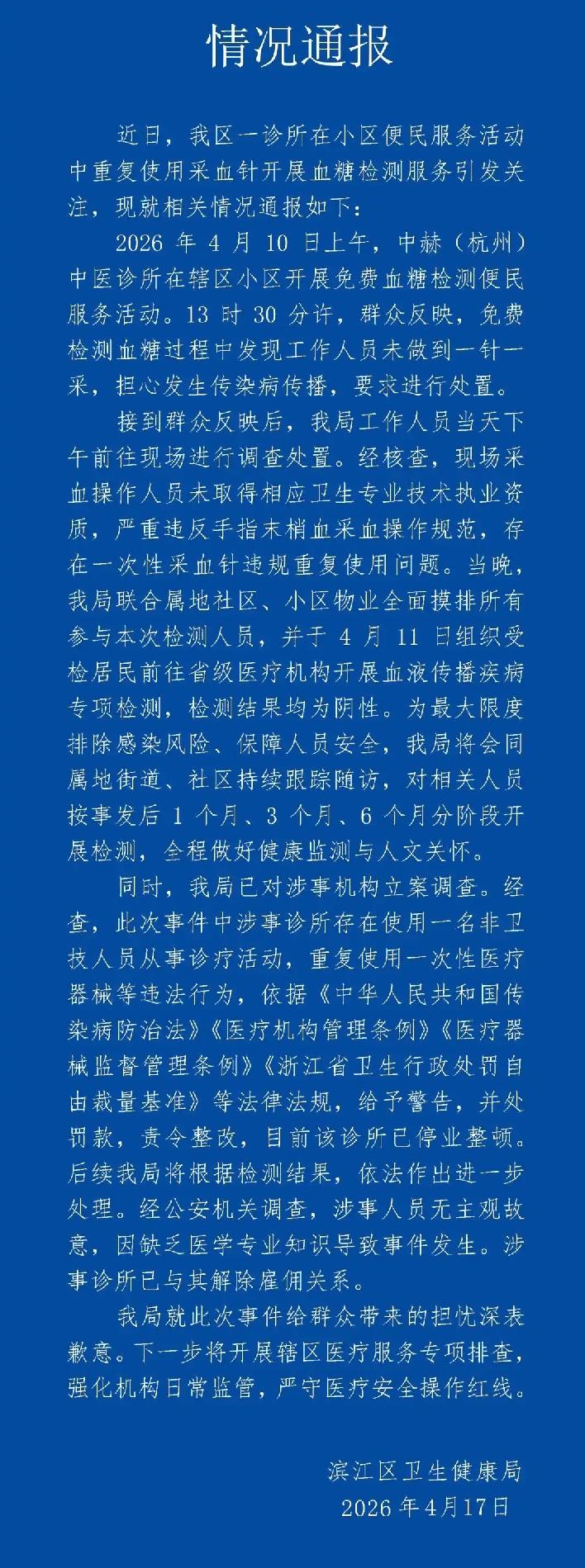事情发生在4月10日上午,杭州滨江区的中赫中医诊所,在辖区的一个小区里搞免费血糖检测便民服务。当时来测血糖的人不少,大概有15个人左右。可谁能想到,工作人员竟然不换针头,一直用同一个扎!有居民觉得不对劲,当面问采血针头换没换,工作人员嘴上说“换了”,可居民翻看现场垃圾袋,根本找不到废弃的针头。这一质问,直接把问题揪了出来——针头重复使用,这么严重的违规操作,居民当场就炸了锅。