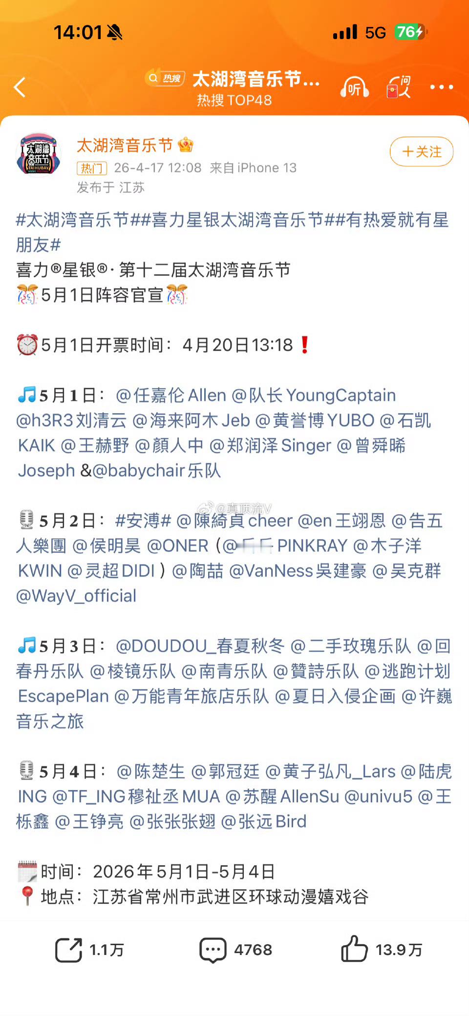 太湖湾音乐节官宣任嘉伦 官宣落地!五一太湖湾,红海奔赴而来,静待任嘉伦全开麦舞台