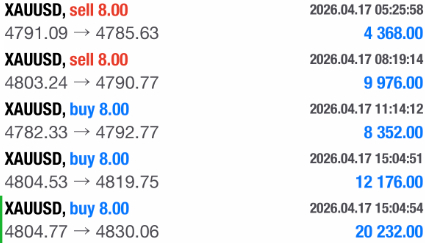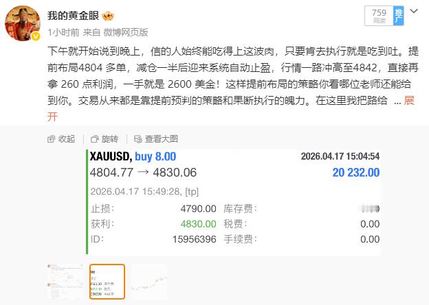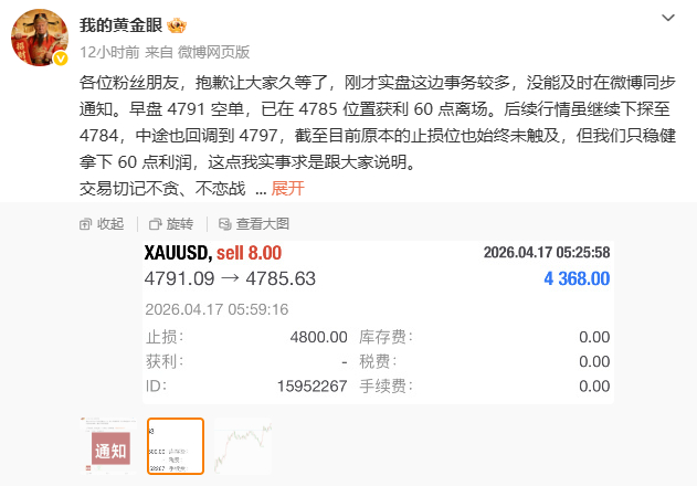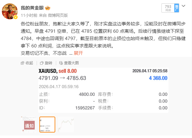 总结:4月17日共做两单,大获全胜。 总盈:300点。 4791空单4785离场,拿下60点 4804多单4830止盈,拿下240点按咱们一贯的风格,实盘当中的利润依旧是不加到总结里面来的,实实在在,盈利不夸大,亏损不躲藏。回顾昨日的操作还是偏保守稳健的,先是早盘拿下开门红,然后一整个下午都是只在实盘当中分享策略了,因为昨天午盘的行情走得偏快,微博哪怕分享了也很难跟得到,也没必要去做那种马后炮策略。直到晚盘咱们才开始发力,布局了一手4804多单,实盘当中同步喊学员们半路减仓一半,最终在4830触发止盈,拿下240点收官。黄金 金价