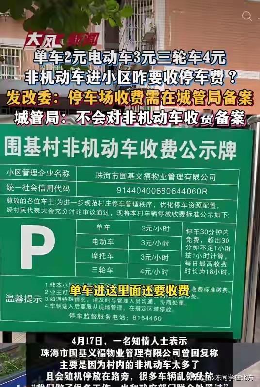小区向非机动车收取停车费!最近广东珠海一小区出台了停车收费新规:自行车停一次收2元,电动车3元,三轮车直接涨到4元,就连日常代步的非机动车,进小区停个车都要花钱,这事一经曝光,立刻引发了大家的激烈讨论,物业和官方部门也先后给出了回应。