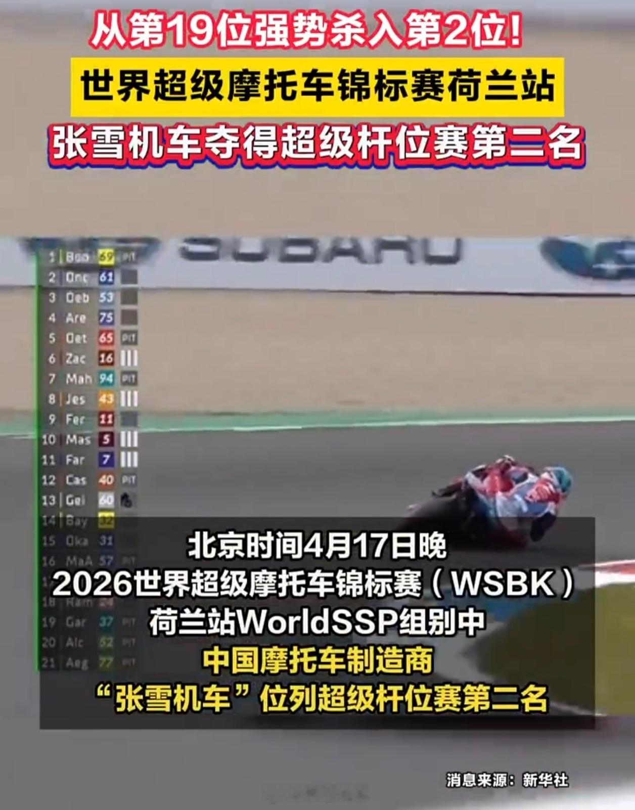 张雪机车排名一路狂飙张雪机车这次在荷兰站真的太猛了。本来因为之前成绩好被规则制裁,增重又减动力,排位赛一开始还掉到19名,结果最后一圈直接冲到第二,差一点点就杆位。在这么难的赛道上还能逆风翻盘,能站上WSBK头排,对中国车队来说已经很了不起了。