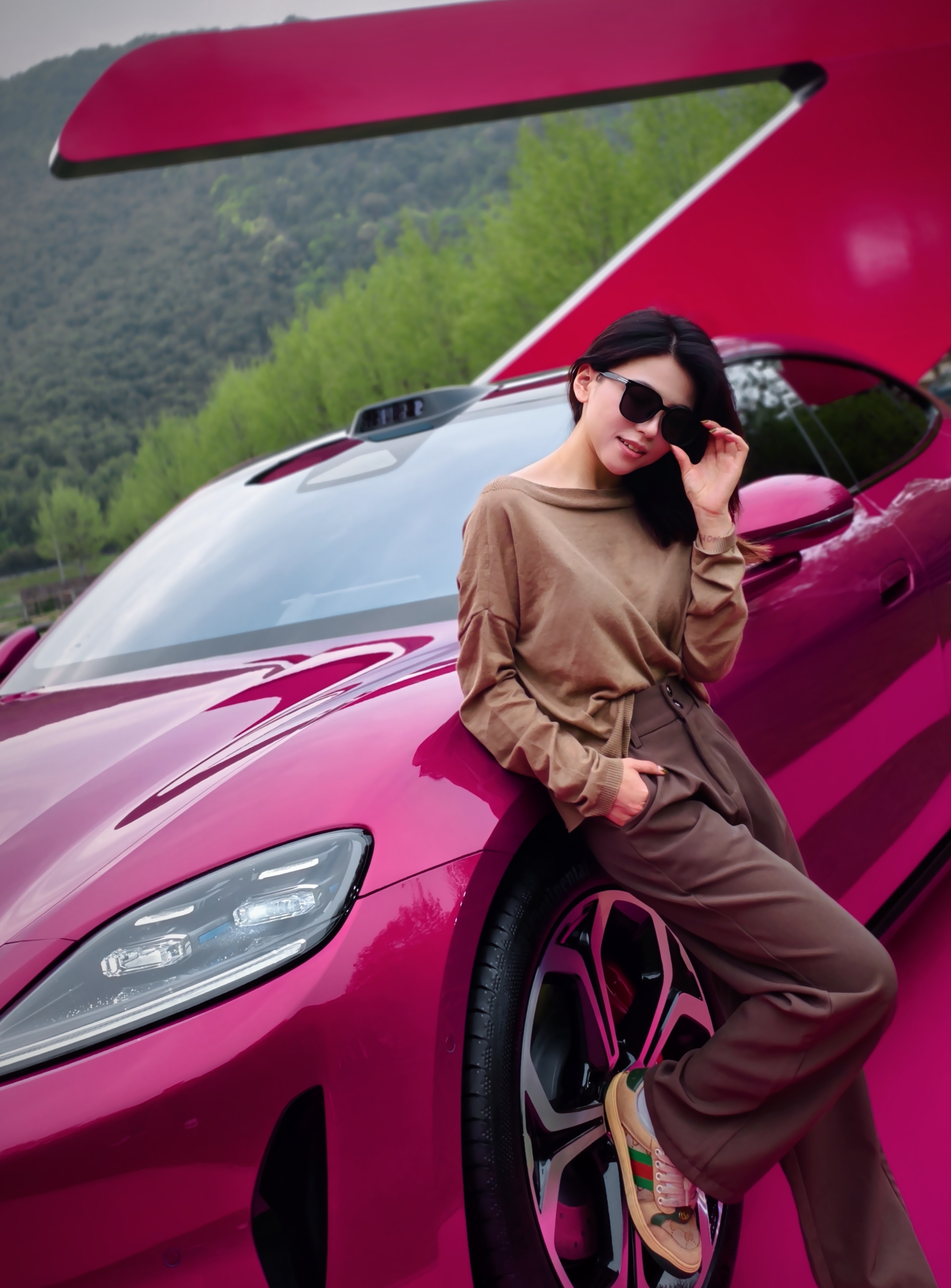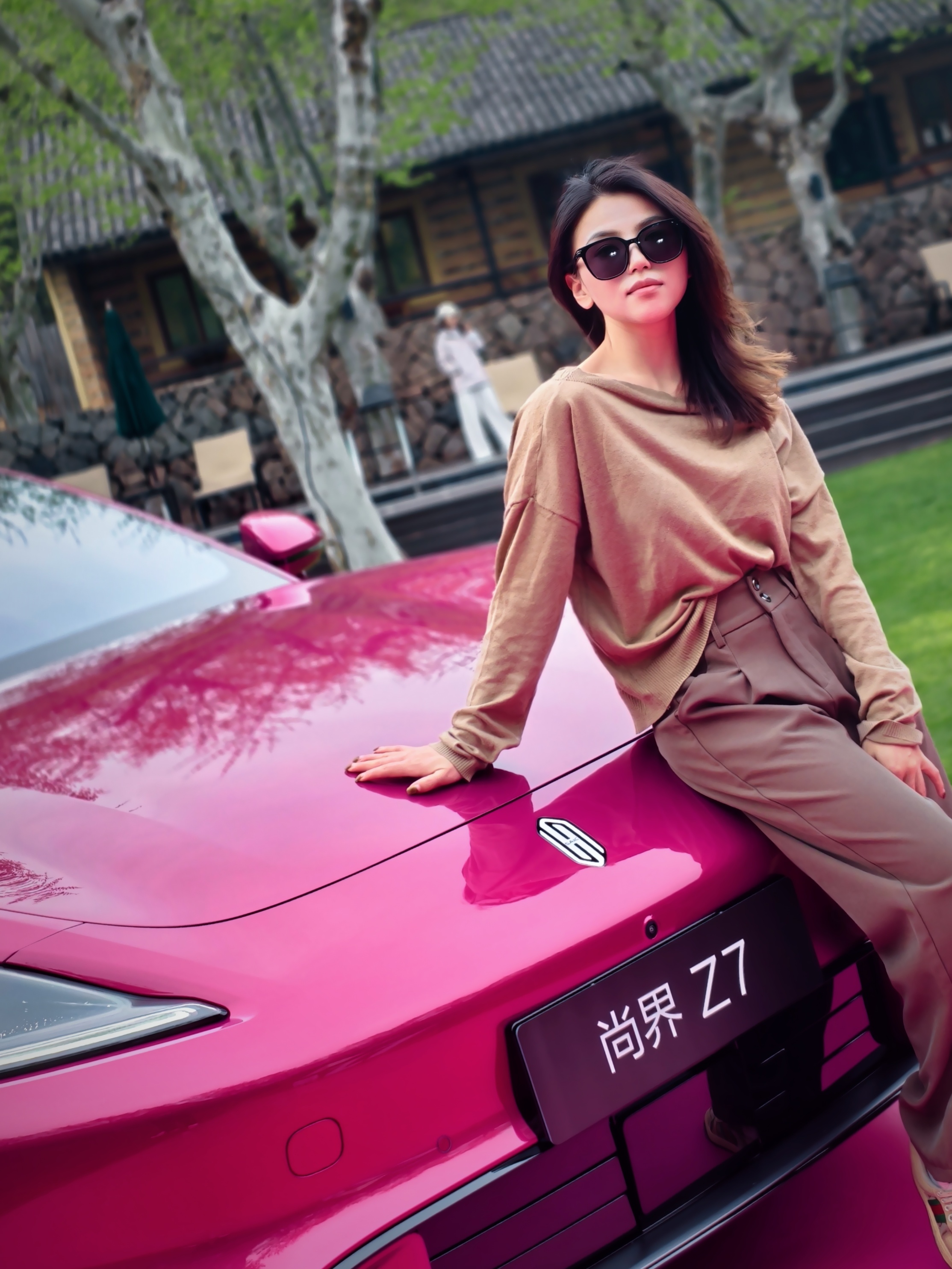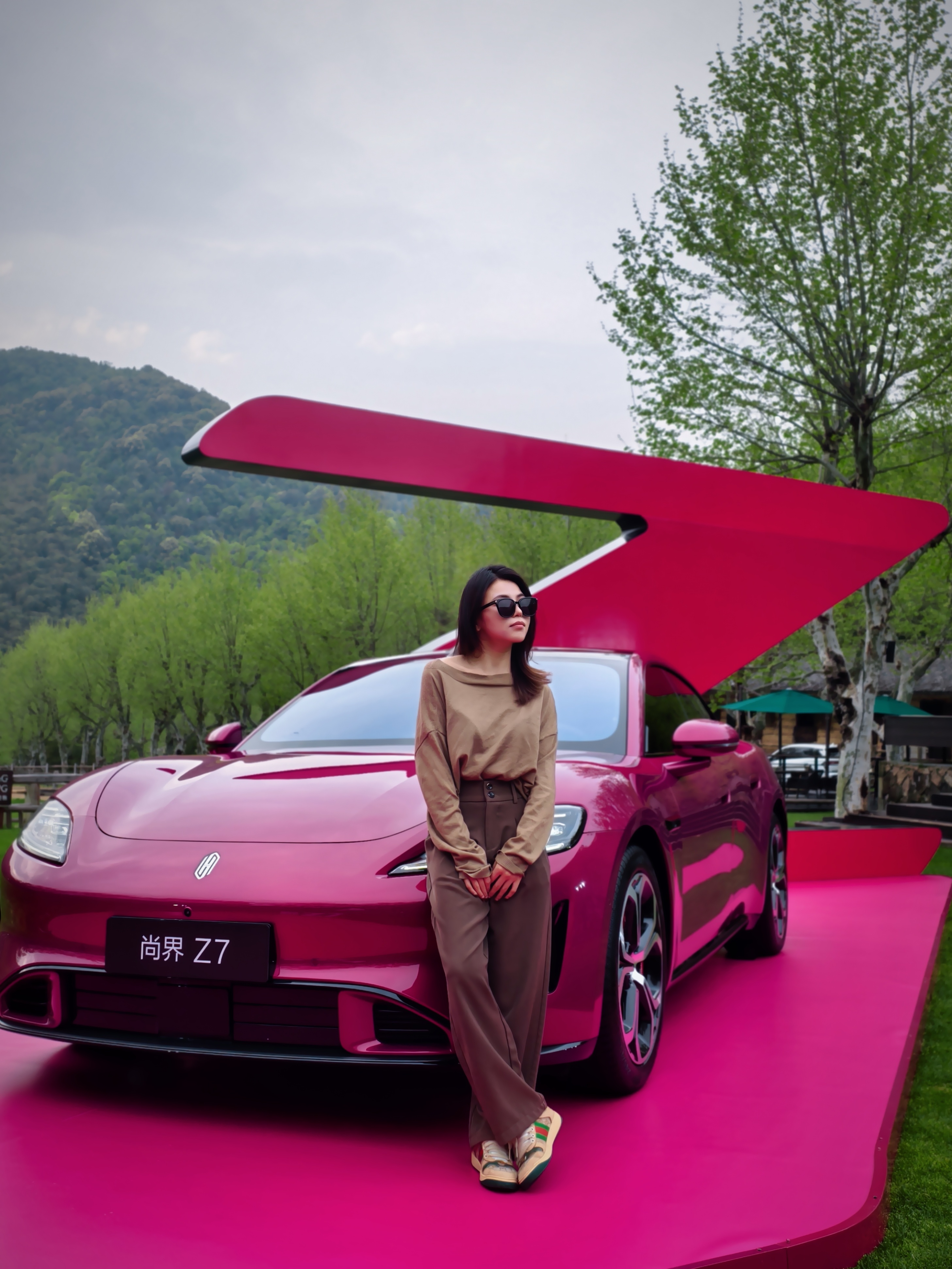 我这身衣服大地色系的质感偏低调沉稳,搭尚界Z7的电光紫粉有种什么感觉呢?