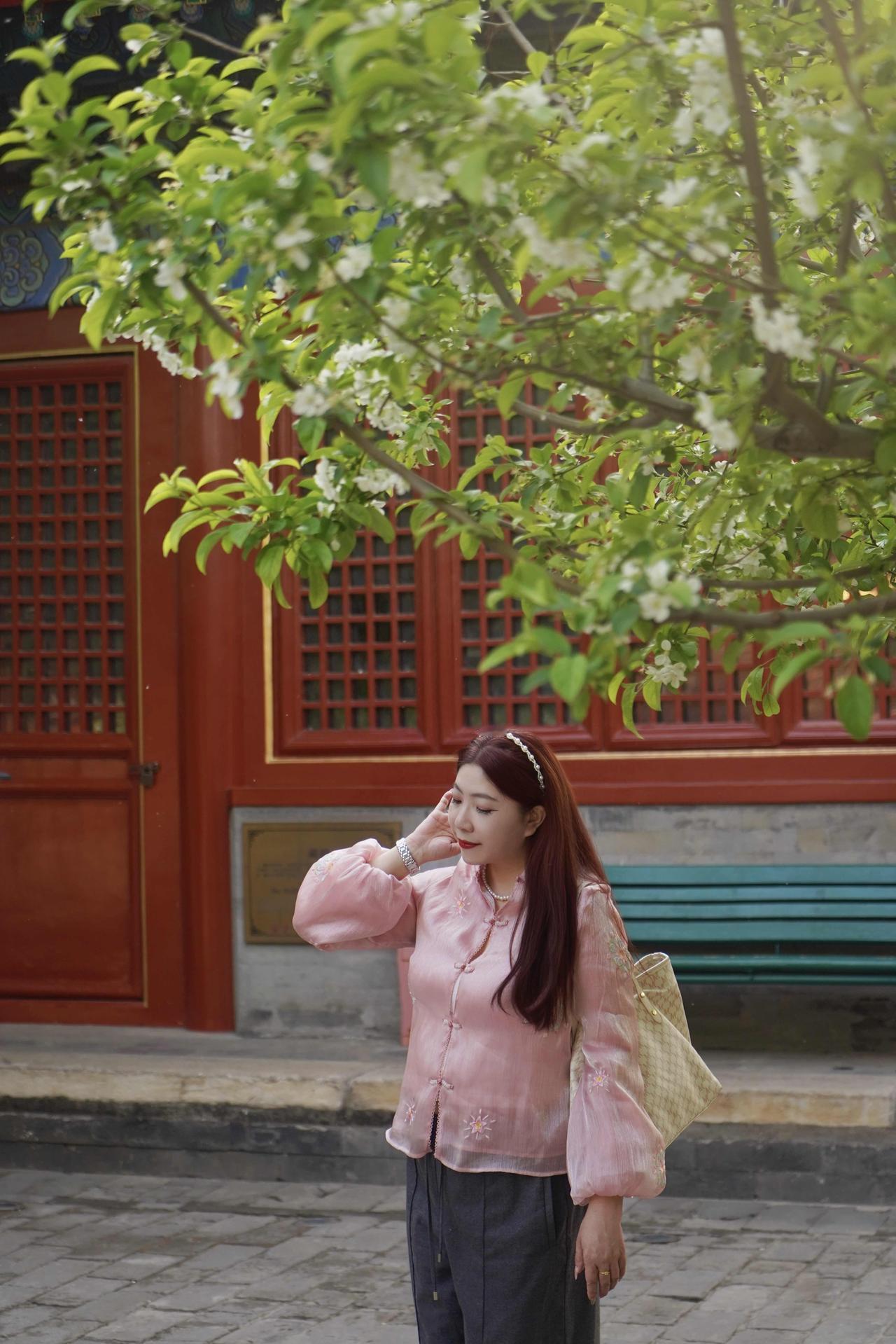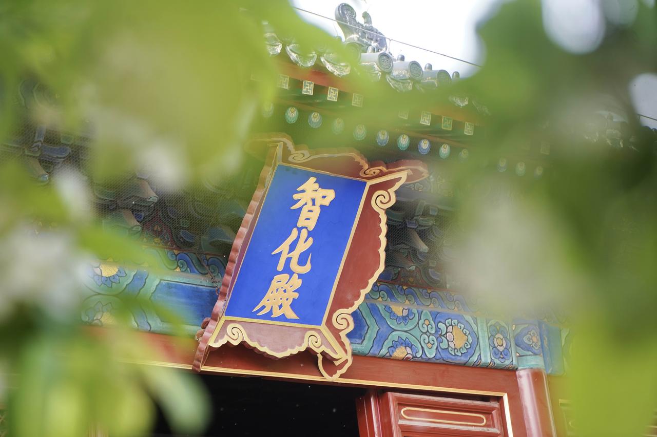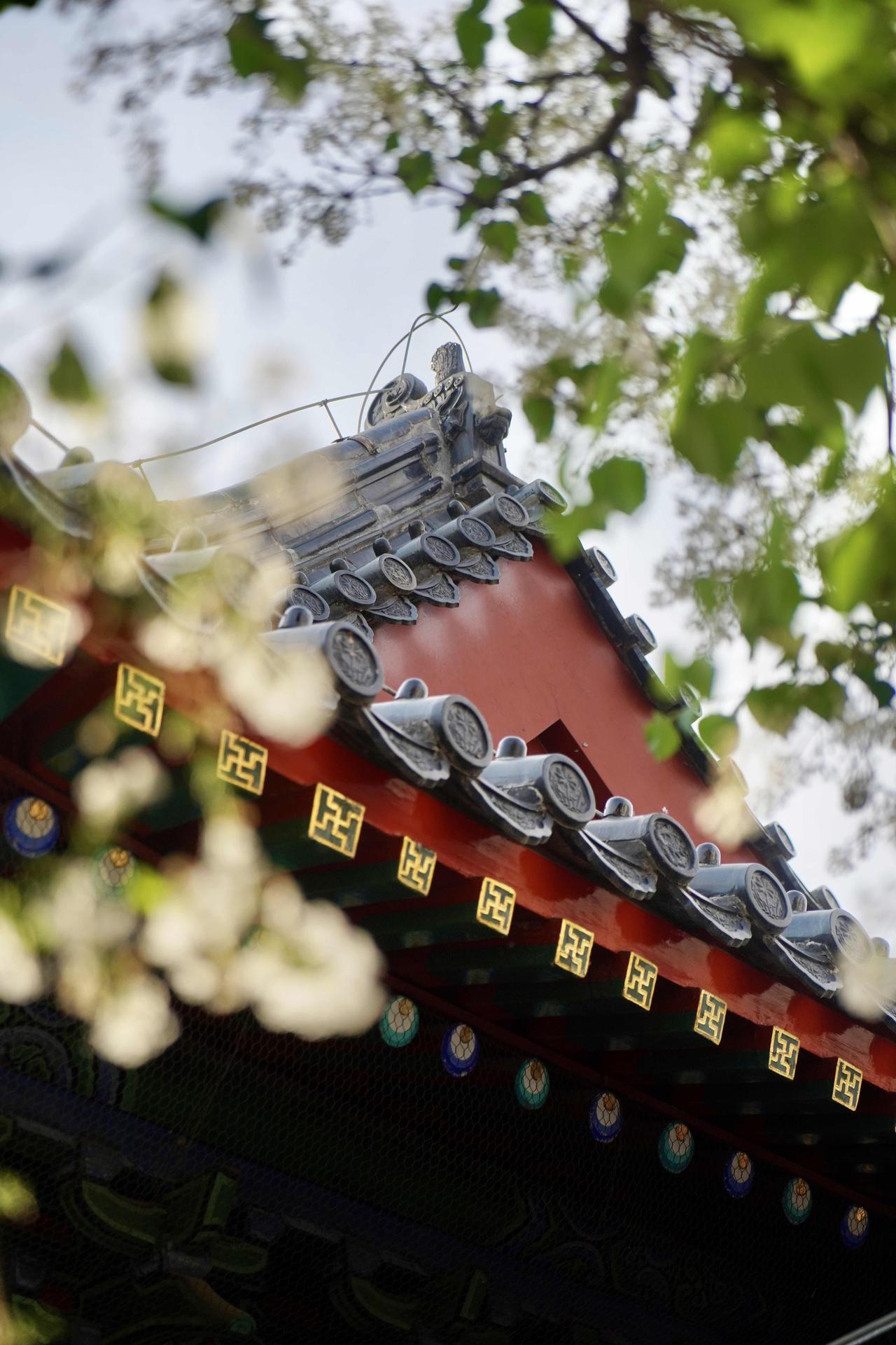 📷 3-4月智化殿门口两株古梨树花开如瀑,院内红墙灰瓦,雕梁画栋,室内有北京现存完整的明代木结构建筑群之一,精美壁画佛像,每天有非遗京音乐表演