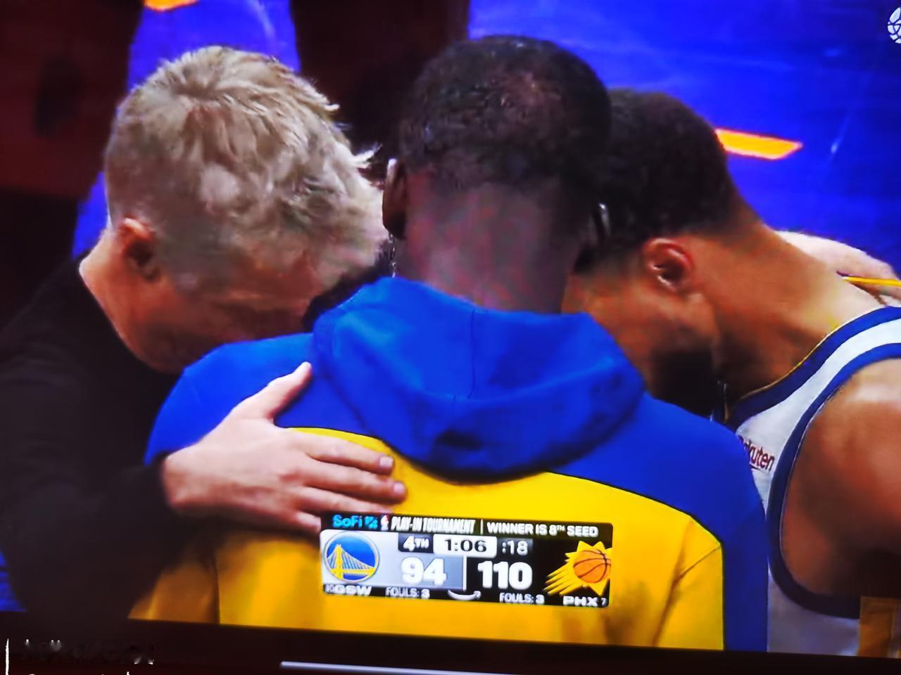 比赛还剩1分钟,勇士落后16分,主教练科尔换下所有主力,分别拥抱了格林和库里,三人抱着肩膀,头顶头围成一个小圈儿,诉说他们自己的秘密。能看得出来,科尔对这两个执教时间最长的弟子,是有很深的感情的,似乎在做告别。