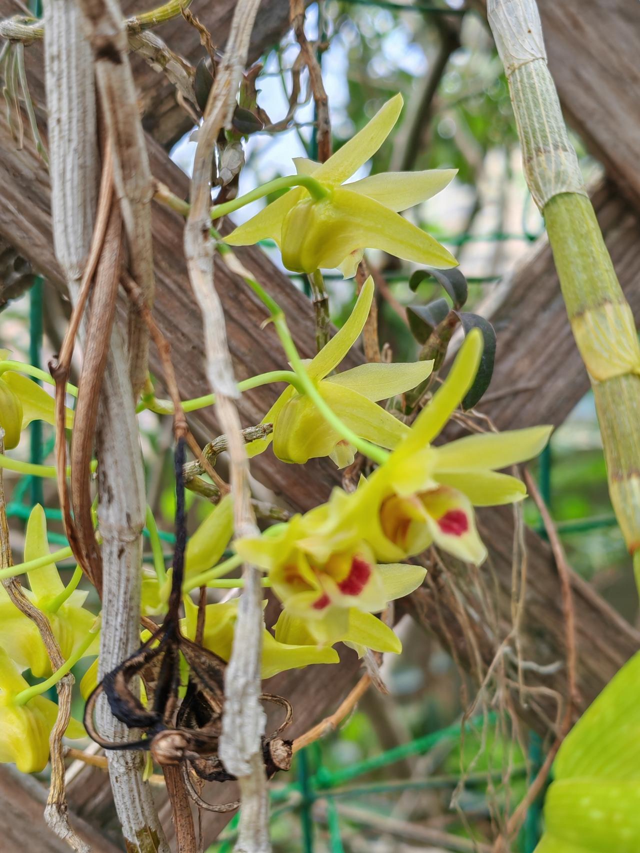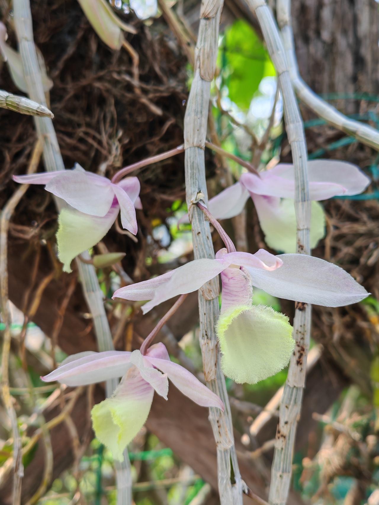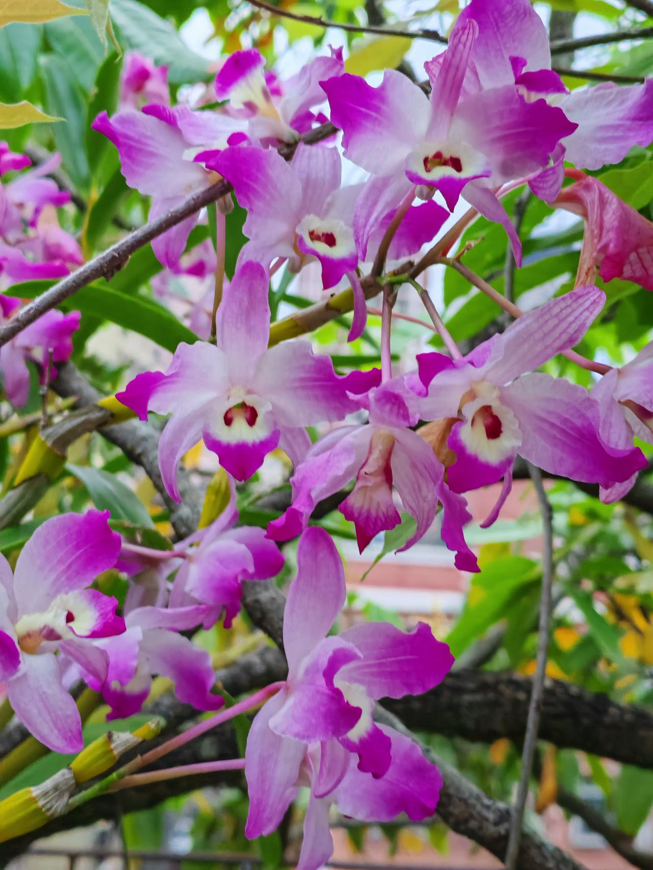石斛兰的花期是哪个时候?现在已是石斜花期的后期了,之前我发过橙色和粉红色的石斛花图片,并介绍说还有淡绿色的石斛花。有的友友在评论区留言,说没见过淡绿色的石斛花,一定很特别。当时淡绿色的石斛还没开花哩。昨天终于开花了,今天专门拍了淡绿色和水红色石斛花,让还没见过的友友们欣赏一下。花朵不大,拍时有点逆光,效果不太好。之前拍的也放在一起,供友友们欣赏。