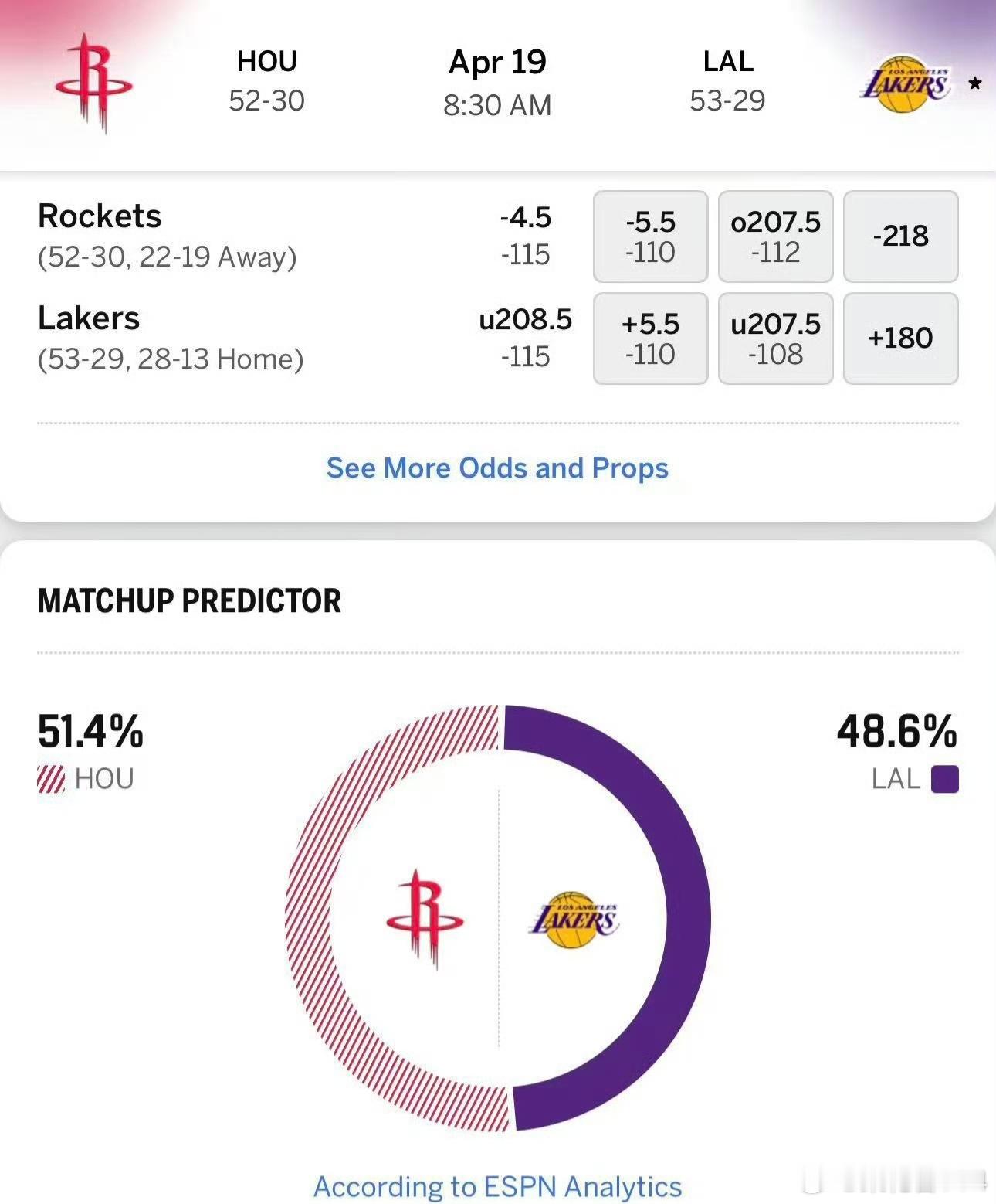 ESPN这次给到湖人胜率只有48.6%,而火箭胜率有51.4%!