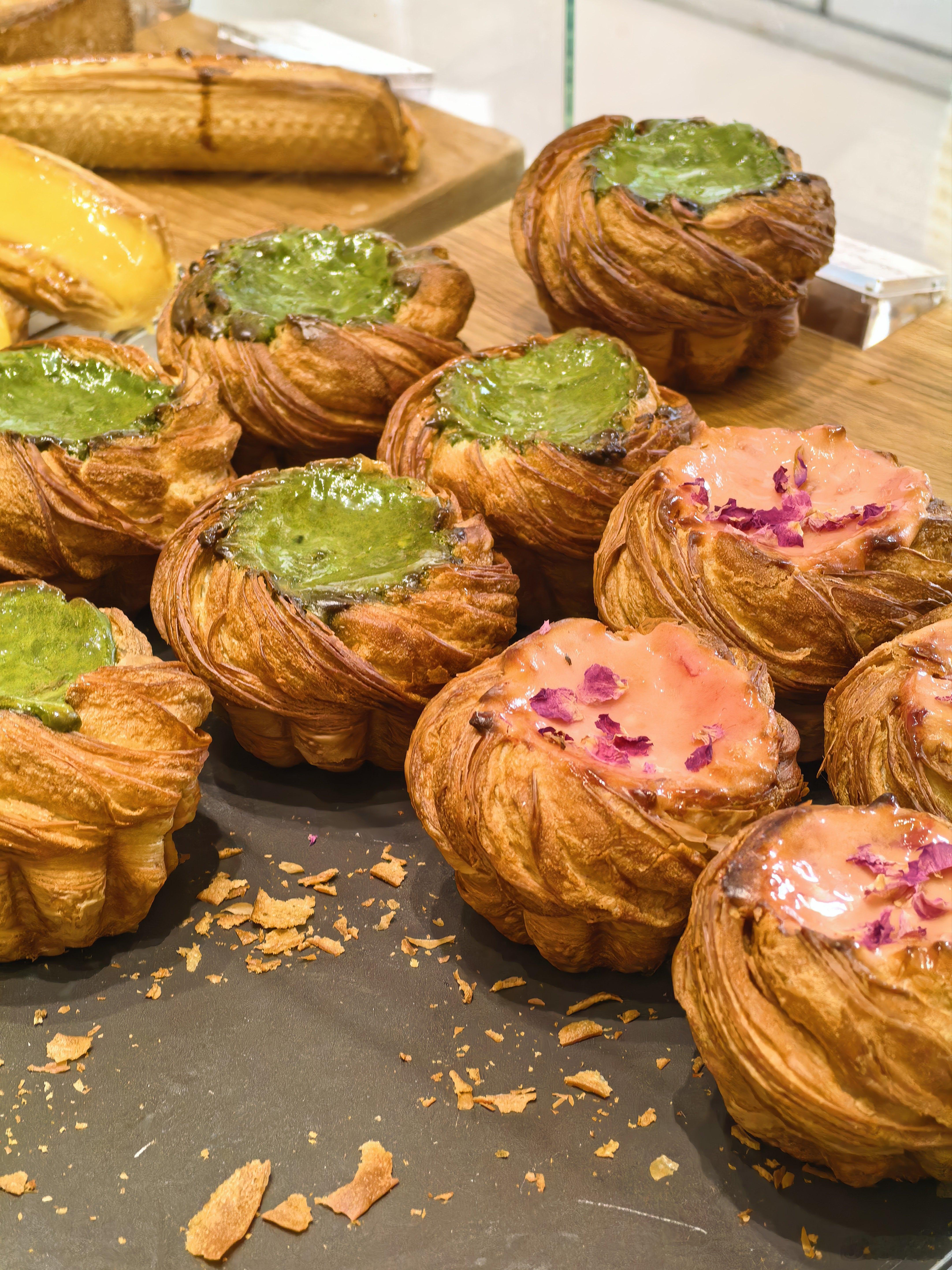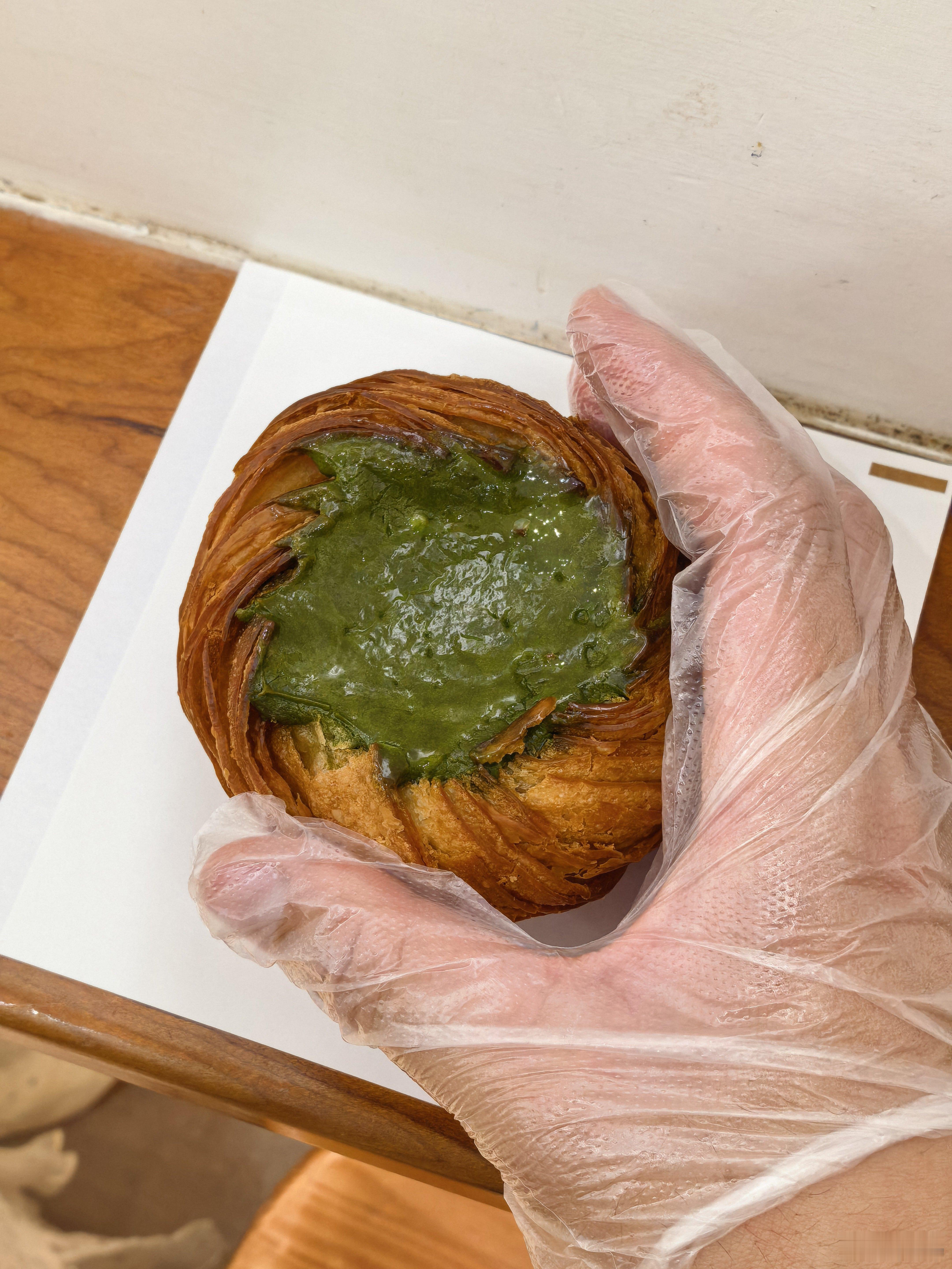 吃完后感觉还不错。但严格来说不算蛋挞,算蛋挞样子的抹茶面包,外面是牛角包,中间是浓厚的抹茶。 我鸿的恋爱日记