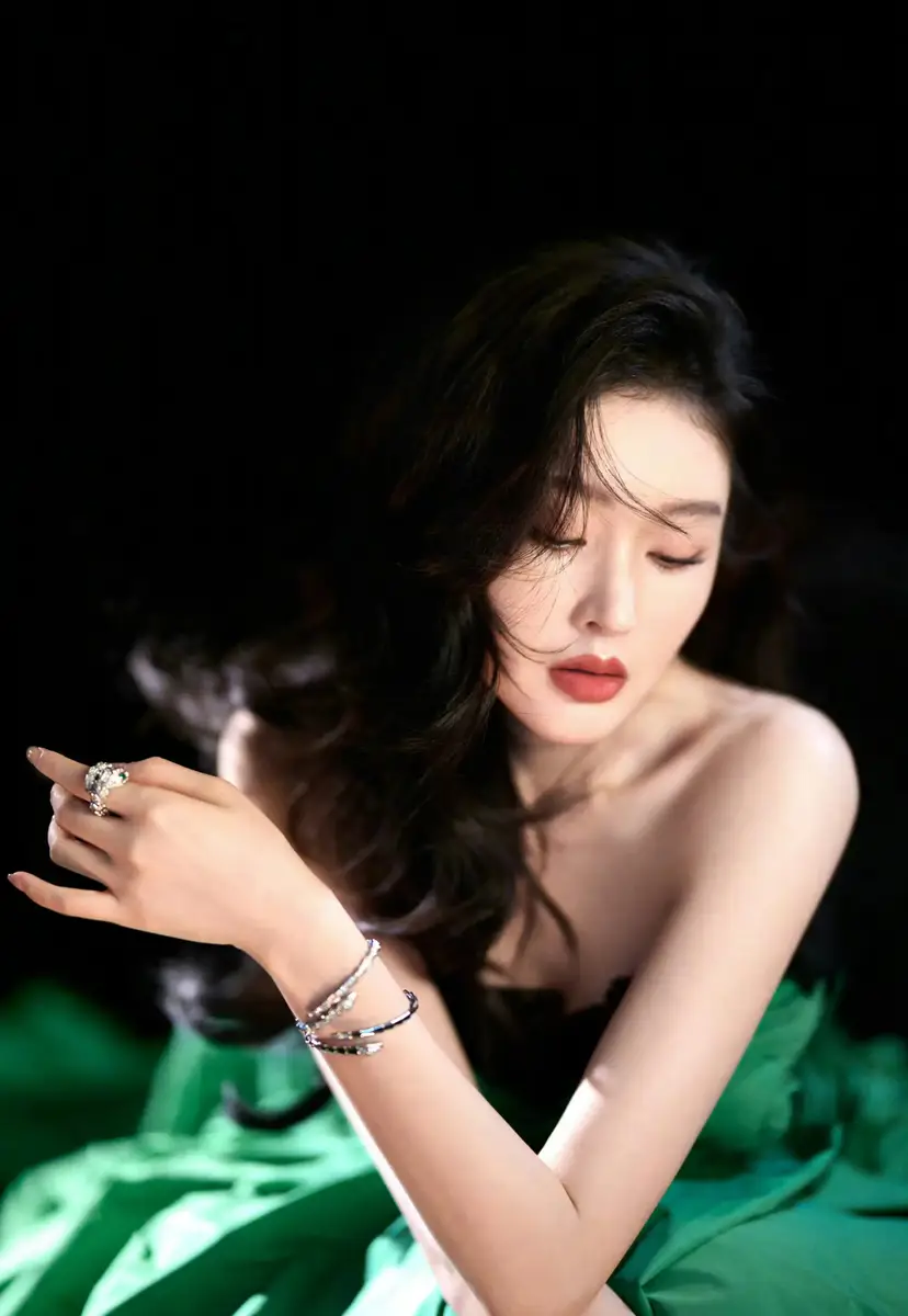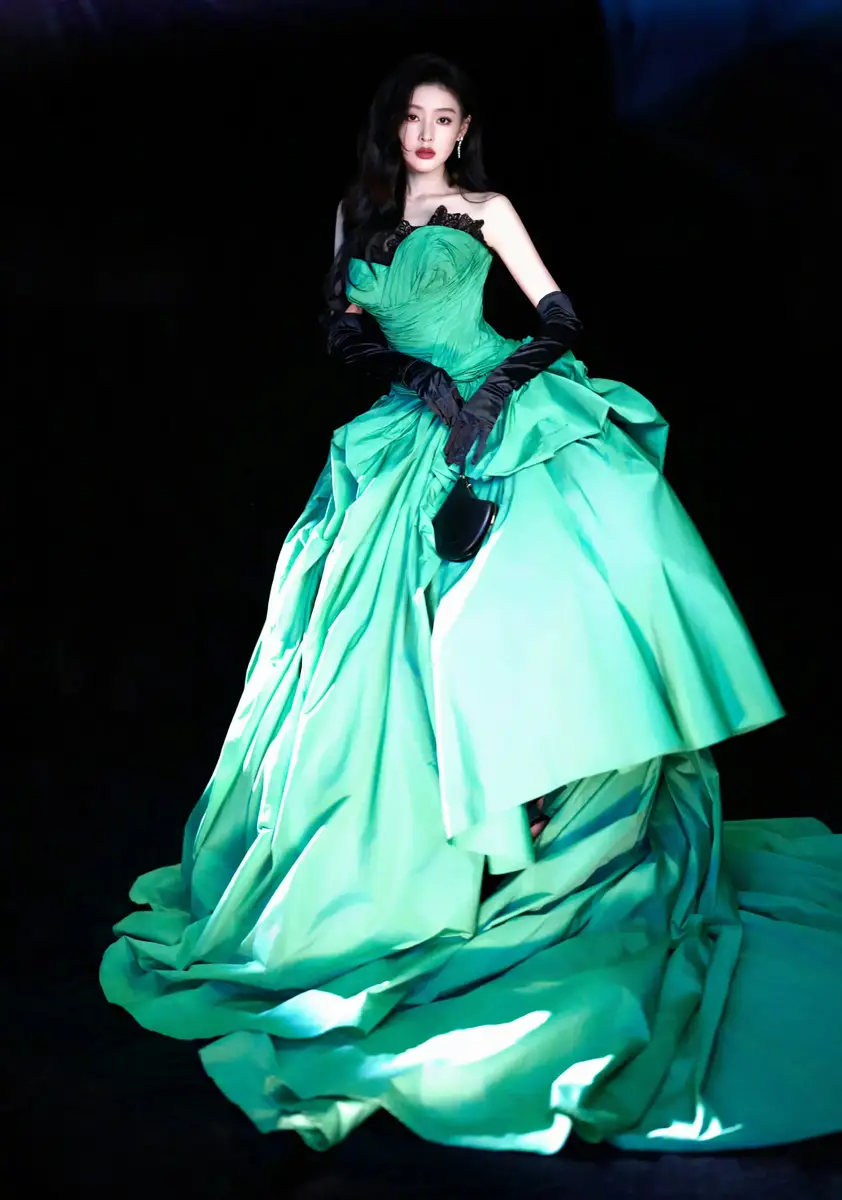 张天爱绿调抹胸蓬裙搭配黑丝手套 红唇明艳自带女王气场