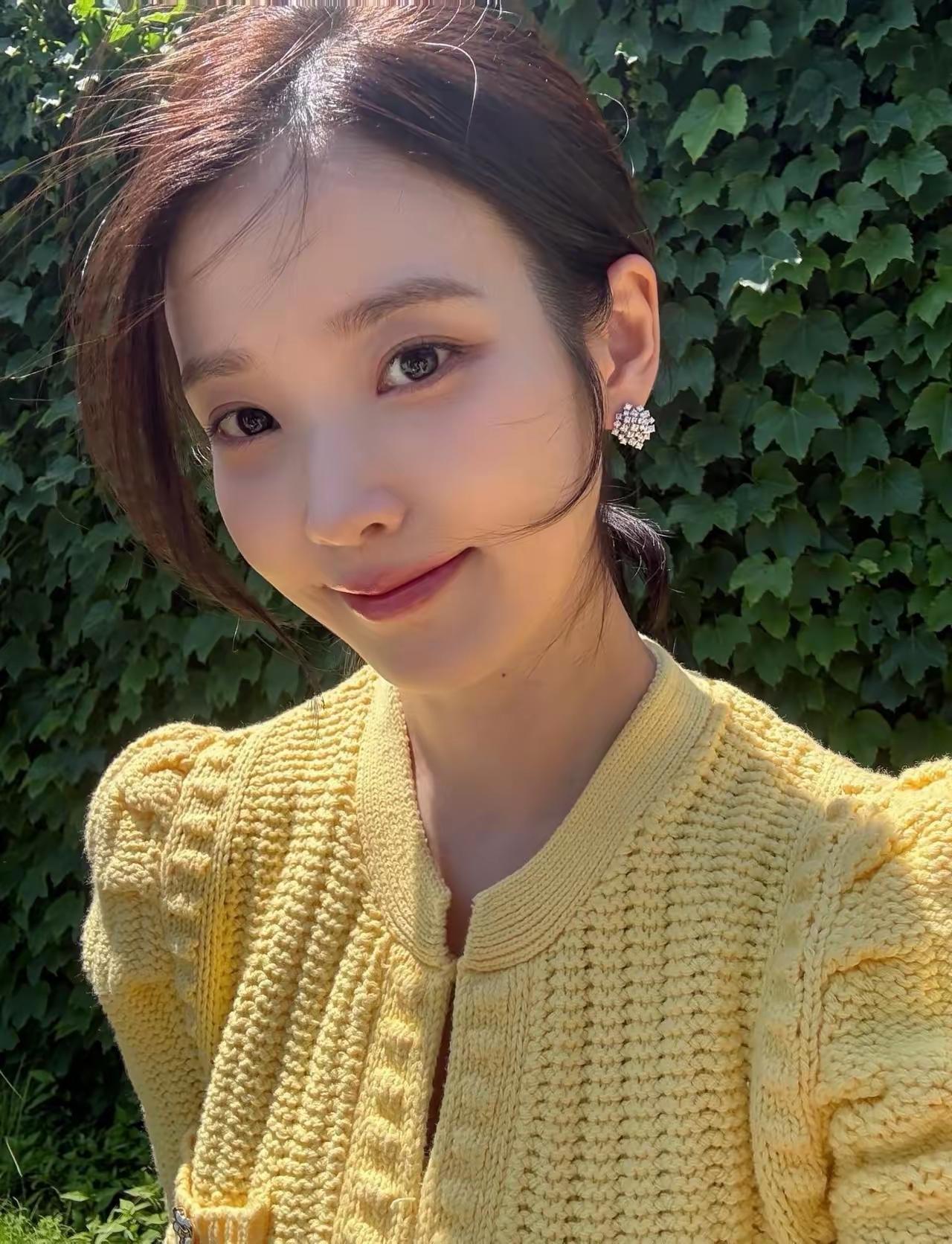 阳光下的温柔少女IU李知恩,黄色毛衣搭配自然绿植,甜美又温暖。🌞💛🌿好美呀