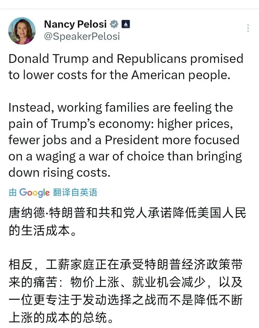 美国前众议长佩洛西,北京时间4月15日发文写道:唐纳德·特朗普和共和党人承诺降低美国人民的生活成本。相反,工薪家庭正在承受特朗普经济政策带来的痛苦:物价上涨,就业机会减少,以及一位更专注于发动选择之战而不是降低不断上涨的成本的总统。