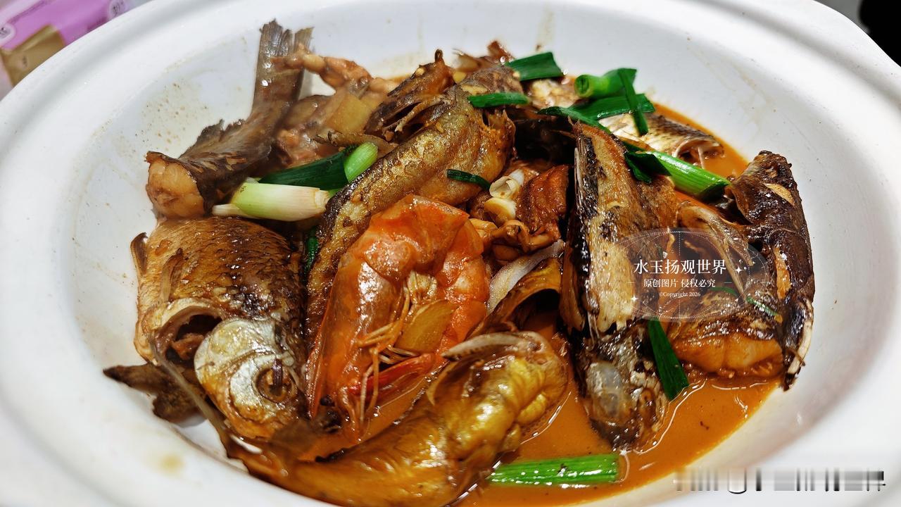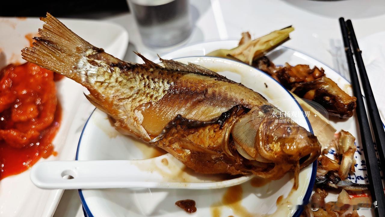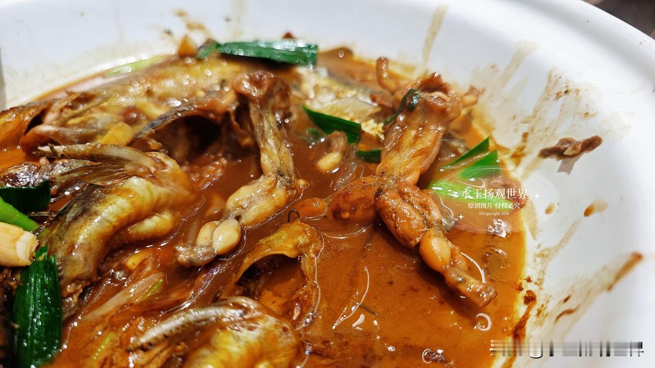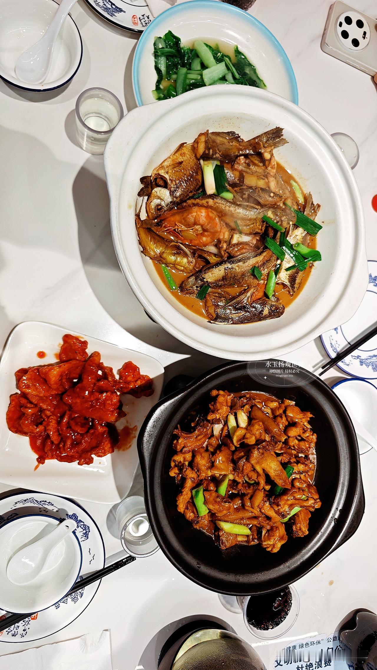 溪水杂鱼一上桌就惊到我了,满满一锅都是小溪里的野生鱼,小的只有手指长,大的也不过巴掌大,裹着亮红的酱汁,上面撒着翠绿的葱花和小米辣。夹起一条最小的餐条鱼,连头带尾一起咬,外皮焦香酥脆,鱼肉嫩得像豆腐,入口即化还没有一点腥味。里面还有几条小昂刺鱼,肚子里塞着腌菜,酸香和鱼鲜混在一起,配米饭简直绝了。我最喜欢用鱼汤泡饭,鲜得掉眉毛,不知不觉就扒了两碗,连碗底都舔得干干净净。老板娘说这些鱼都是早上从附近溪流里捞的,现点现杀,怪不得新鲜得像刚从水里捞出来一样。