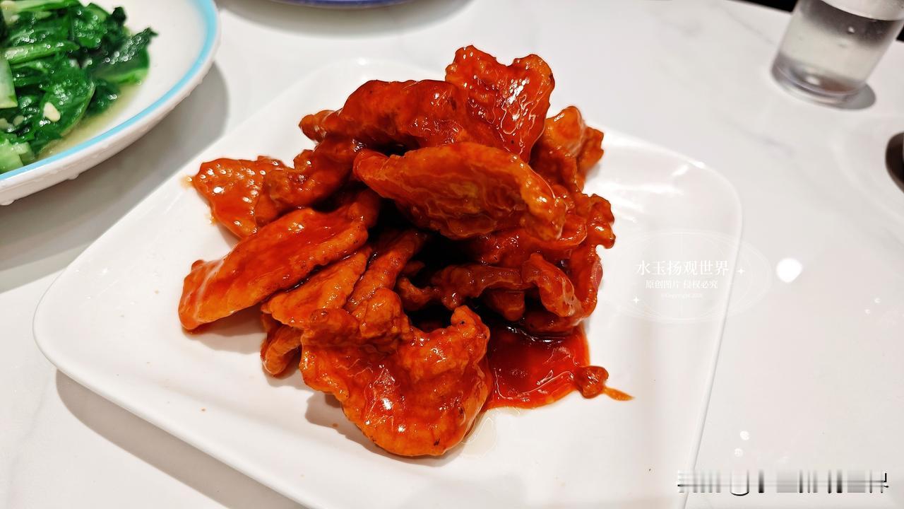 糖醋桂花肉是意外之喜,本以为就是普通的糖醋里脊,端上来才发现藏着巧思。肉切成小块裹着薄糊炸得金黄,外面淋着琥珀色的糖醋汁,上面还撒了一层干桂花,闻起来就有淡淡的桂花香。咬一口,外皮酥脆得掉渣,里面的肉却嫩得能爆出汁水,糖醋汁调得刚好,甜而不腻酸得开胃,桂花的香气在最后才慢悠悠地冒出来,中和了油腻感。我不爱吃甜口的朋友都连吃了好几块,说这是她吃过最不腻的糖醋肉。