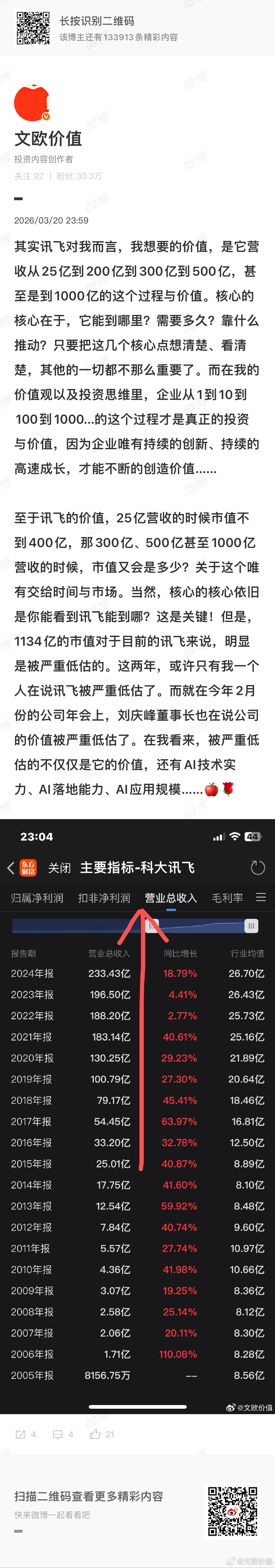 我们2016上半年买讯飞的时候,它的营收是25亿,市值不到400亿。而我想要的价值也很简单,就是它的营收从25亿到100亿、300亿、500亿、700亿甚至是1000亿的这个成长过程。从目前的发展态势来看,2026年注定是AI模型应用爆发开始体现与绽放之年,真正进入AI大规模普及与产业化爆发的周期,真正进入各种颠覆与变革的阶段,AI软/硬件大规模落地开花,深度赋能千行百业,迈向生产力革命。而当下讯飞的AI产业化、AI产品化、AI全球化的步伐正在全面加速度,收入结构与商业模式都在全面加速蜕变之中,可以预见,2025年的营收将近300亿,预计2028年营收将会达到500亿以上…💪🍎🌹