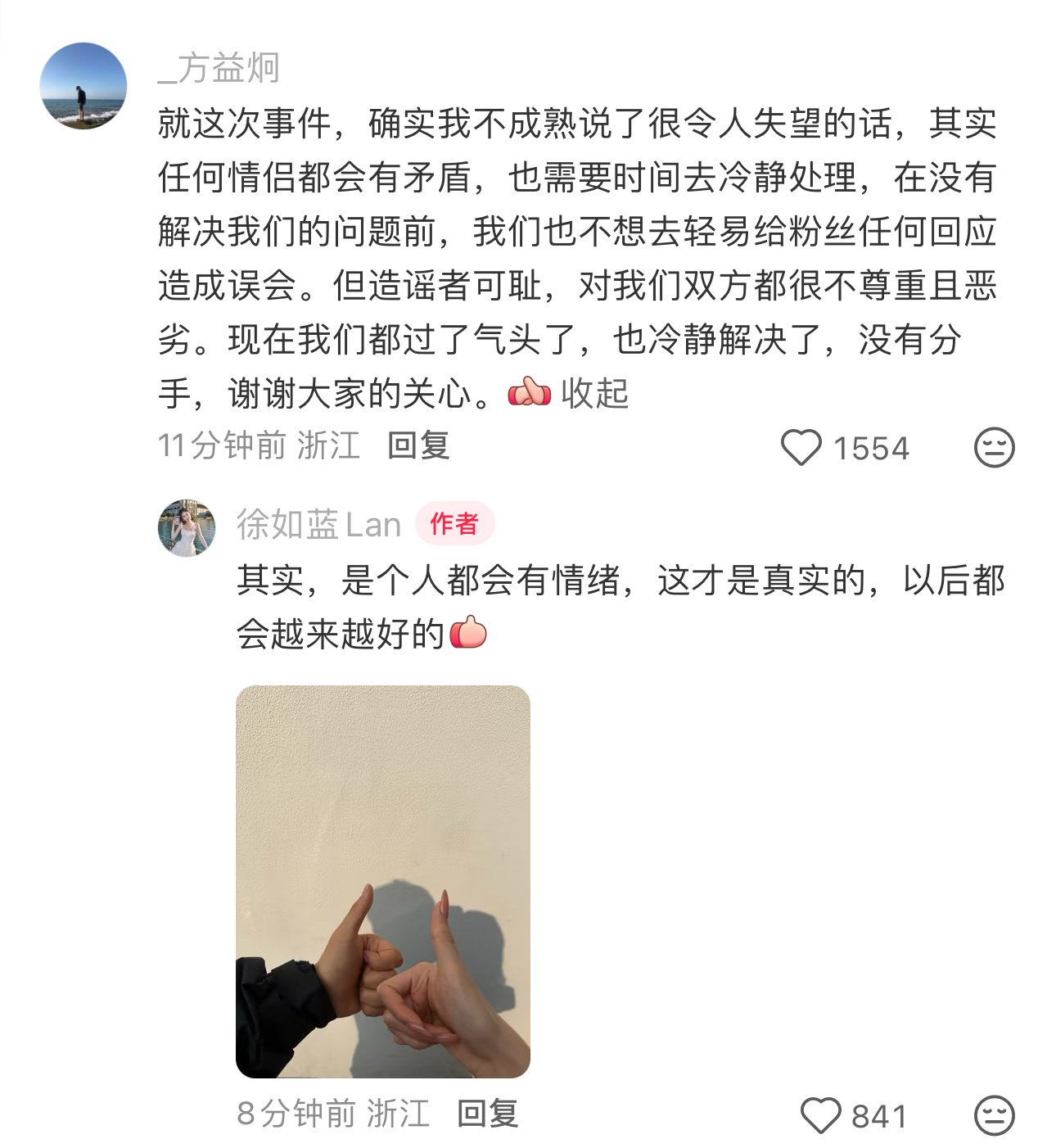 方益炯徐如蓝双方都出来回应了,两个人吵架了,但是现在已经冷静处理好,没分手