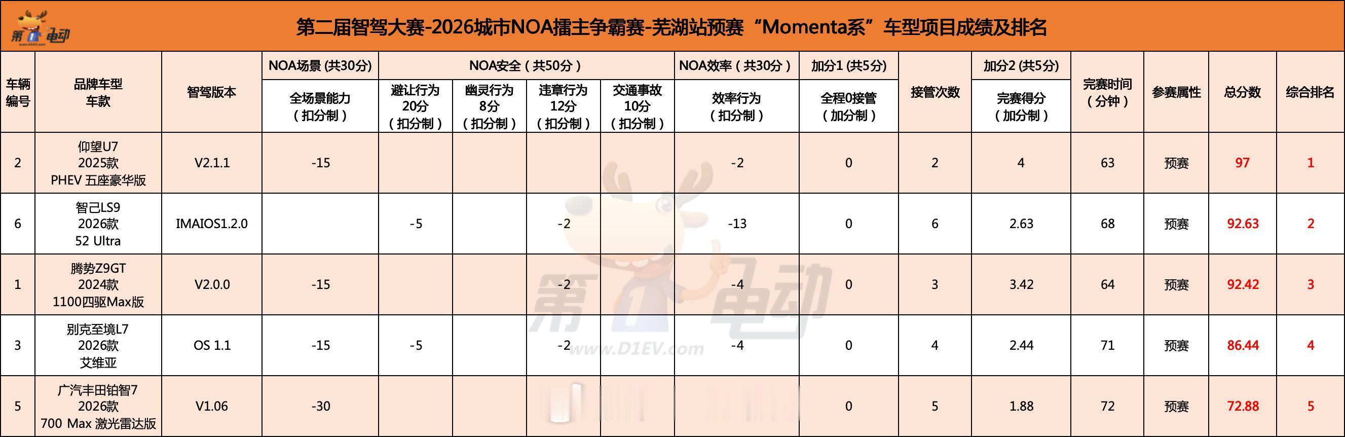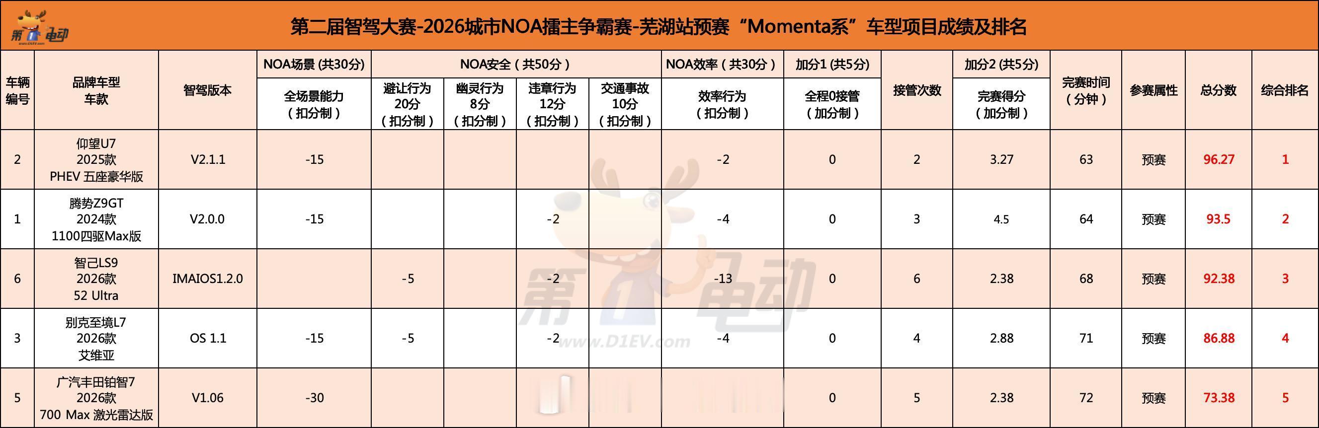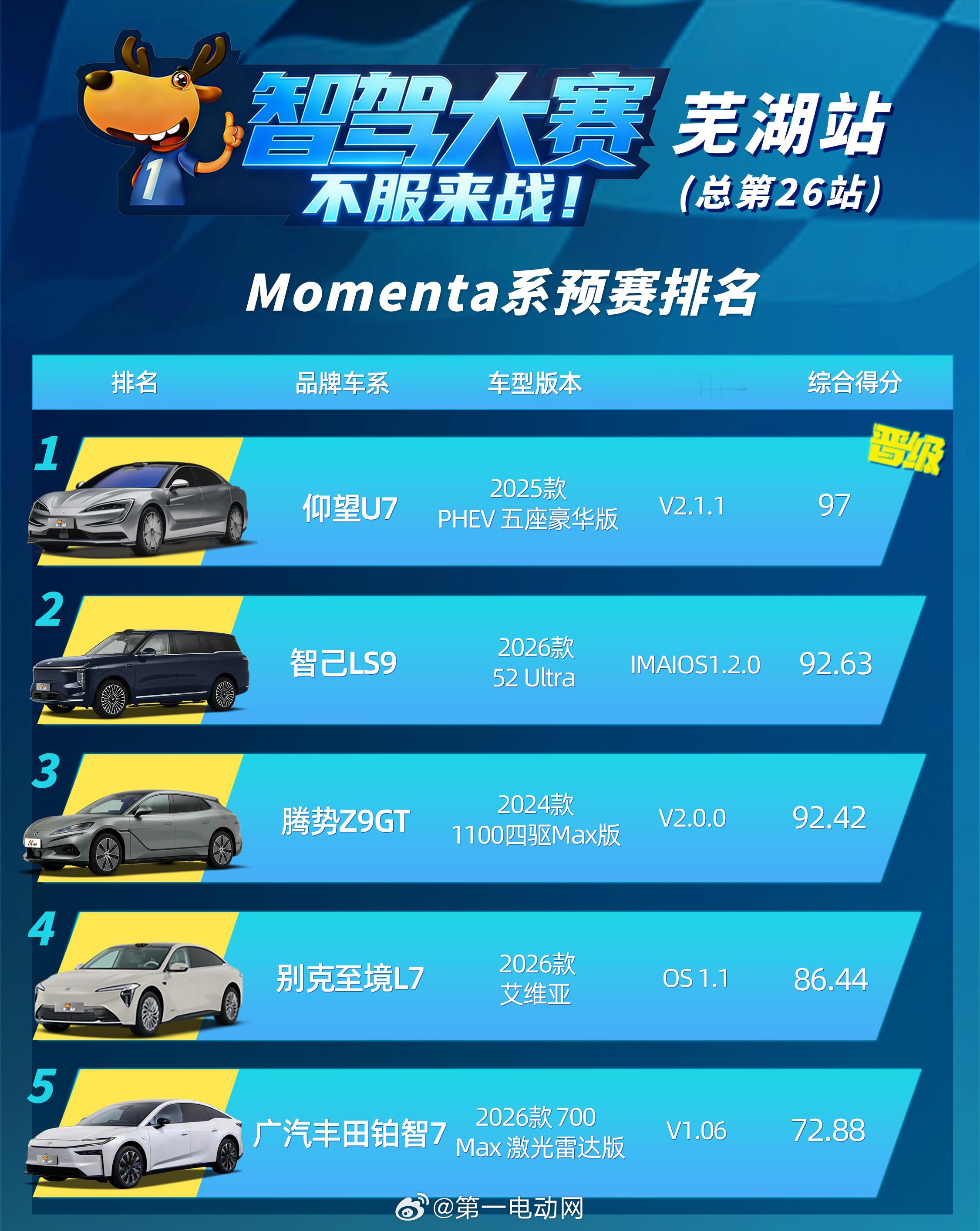 🔵 Momenta系预赛排名(晋级:仰望U7)第1名(晋级决赛) 仰望U7 PHEV五座豪华版 · V2.1.1 · 97分第2名 智己LS9 2026款52 Ultra · IMAIOS1.2.0 · 92.63分第3名 腾势Z9GT 2024款1100四驱Max版 · V2.0.0 · 92.42分第4名 别克至境L7 2026款艾维亚 · OS 1.1 · 86.44分第5名 广汽丰田铂智7 2026款700 Max激光雷达版 · V1.06 · 72.88分