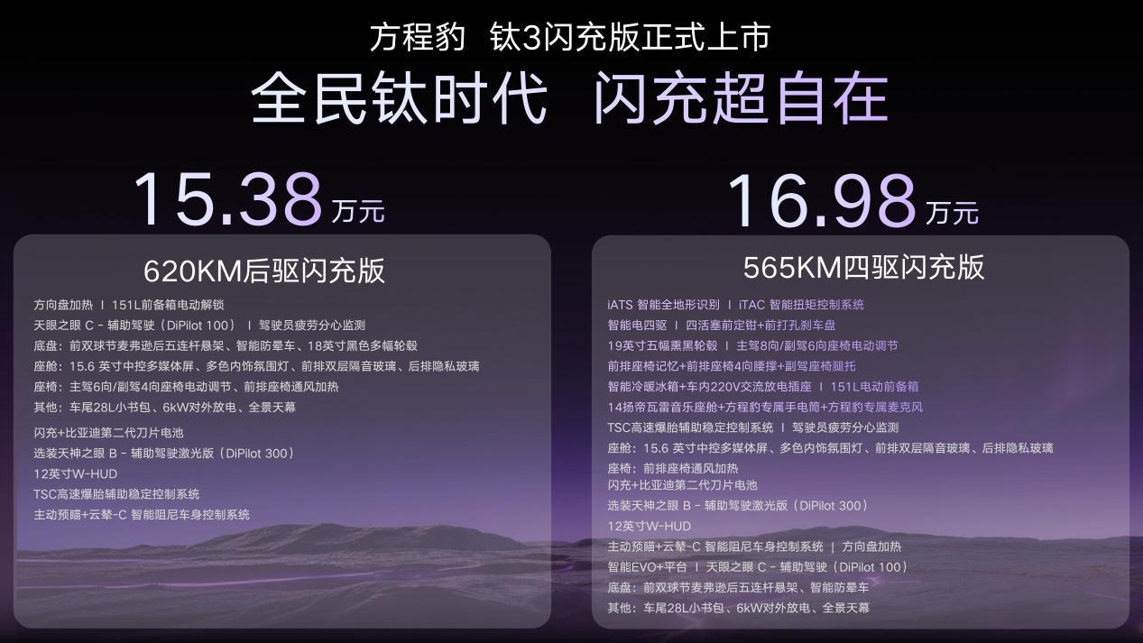 现场公布售价:620km后驱闪充版15.38万元,565km四驱闪充版16.98万元,定价颇具竞争力。
