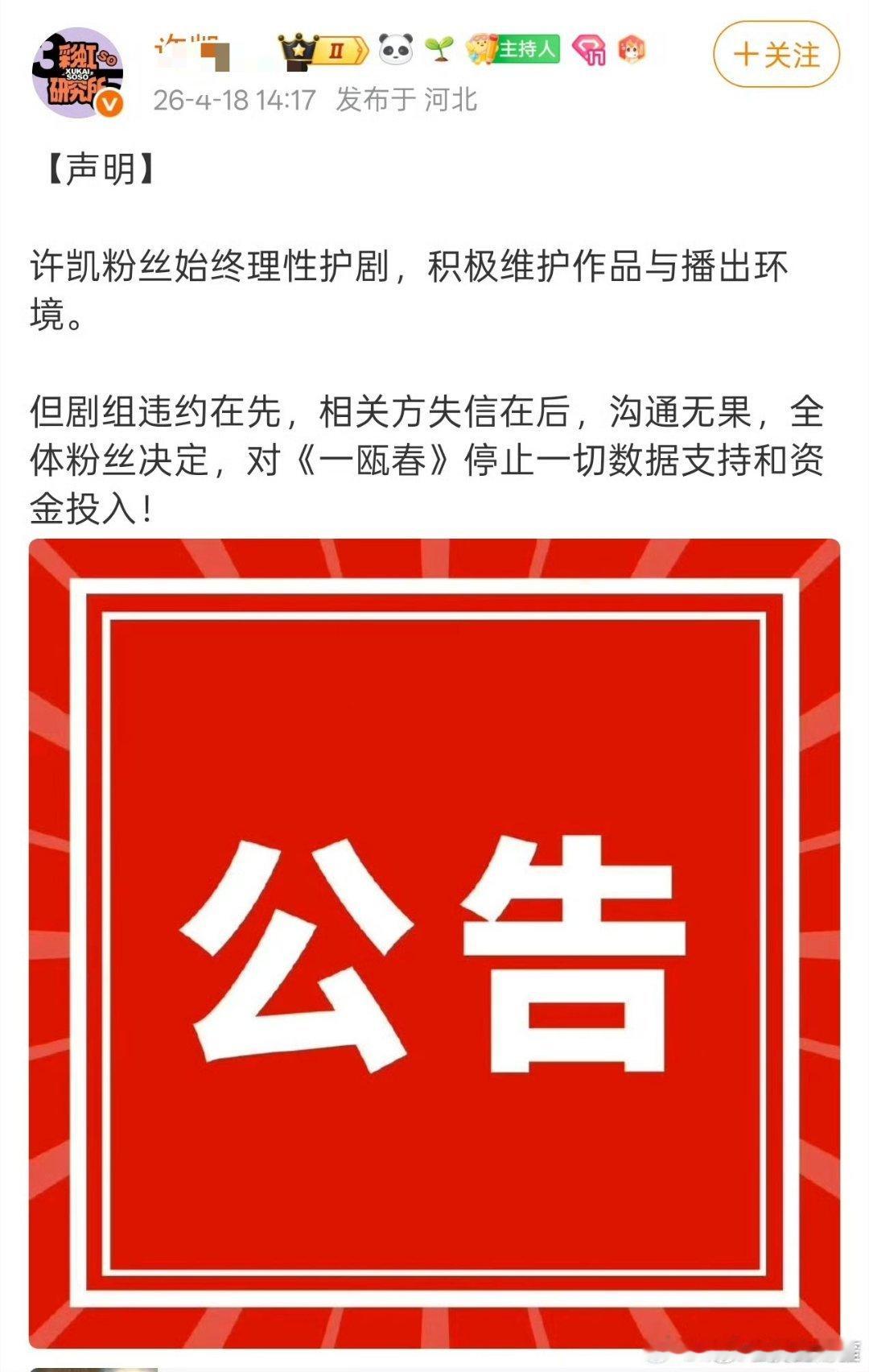 许凯粉丝开启《一瓯春》维权模式了……那确实,人家凭什么因为剧方的不专业吃哑巴亏啊