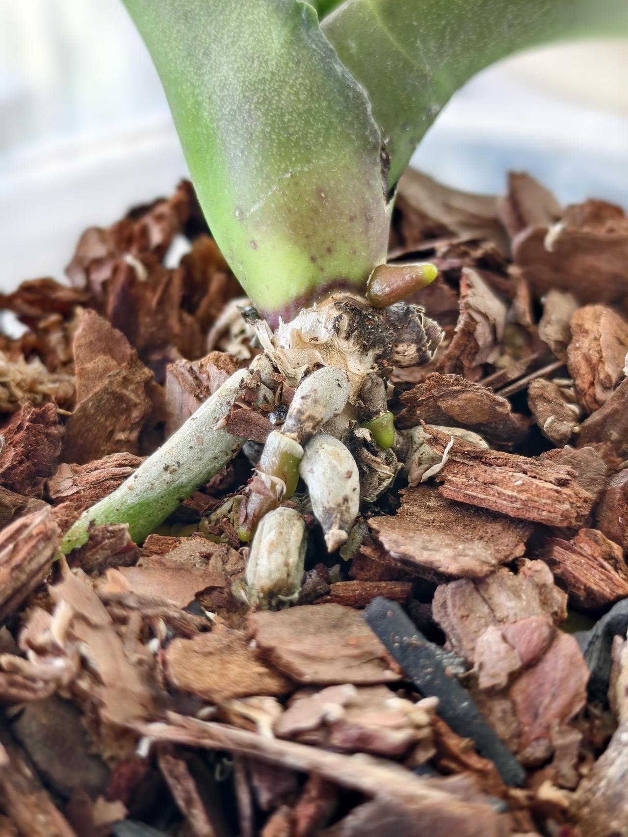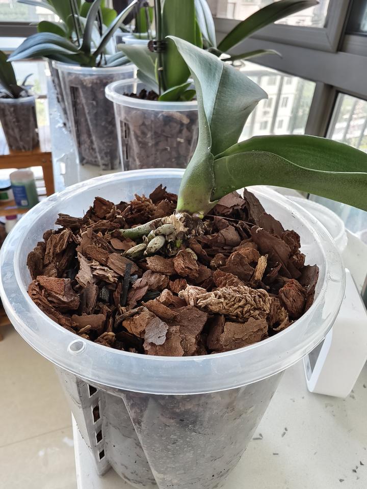养蝴蝶兰第一步买花后苗练手,20多天过去了,已长出水晶头,说明成活了!