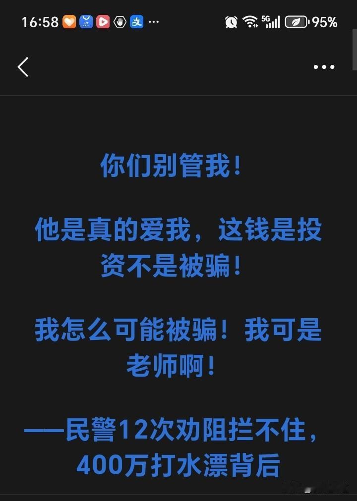 民警12次苦口婆心的劝阻, 抵不过骗子一句精心包装的“我爱你”; 银行反复预警的