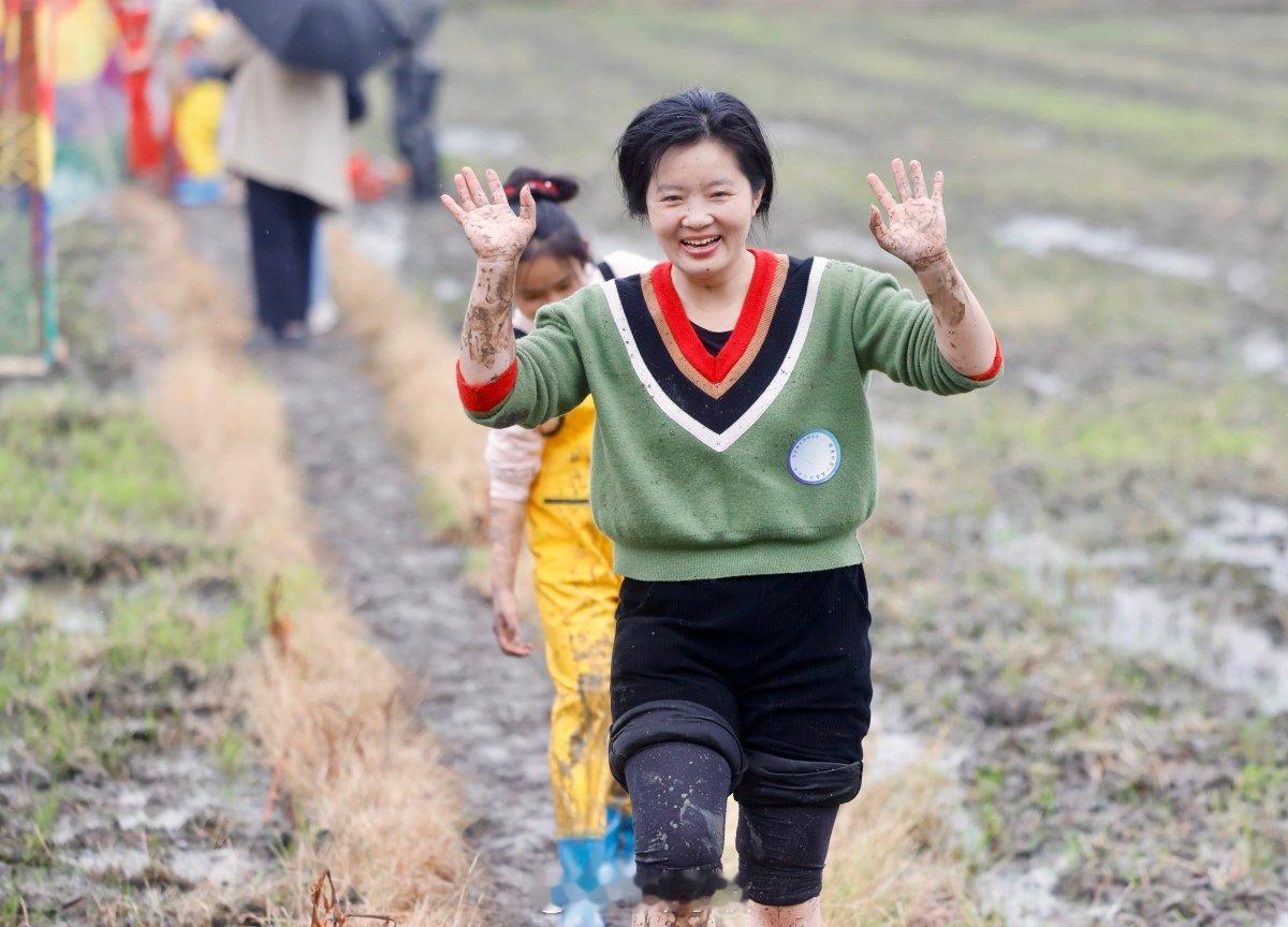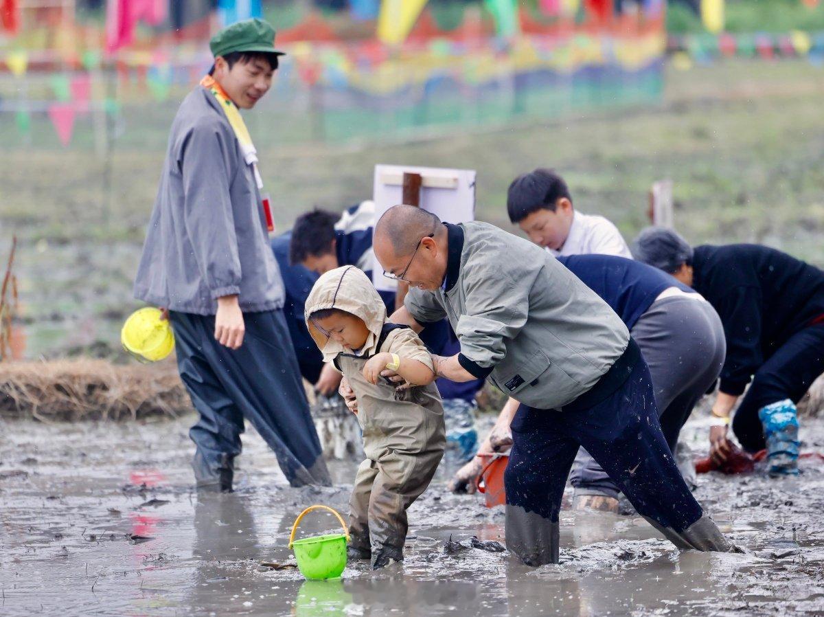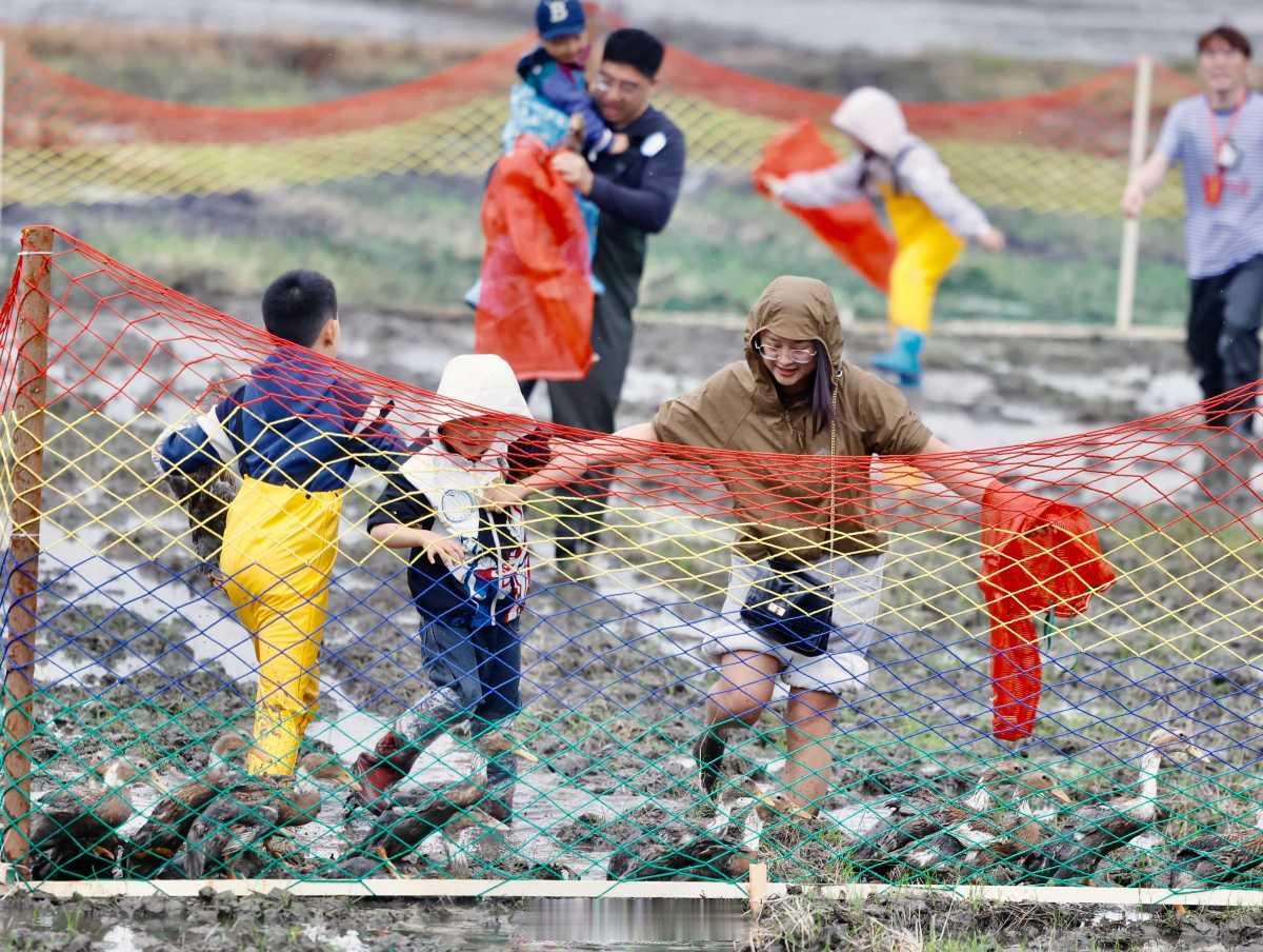 现场设置稻田运动会,抓鸭、摸泥鳅等项目人气火爆,大人小孩齐参与,乐趣满满。复古游戏集市汇集滚铁环、踢毽子、抖空竹等老底子游戏,勾起众人童年回忆。