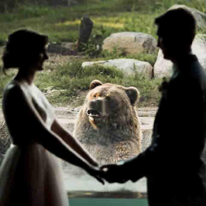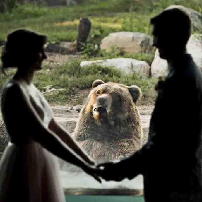 一对新人在动物园结婚,熊的表情