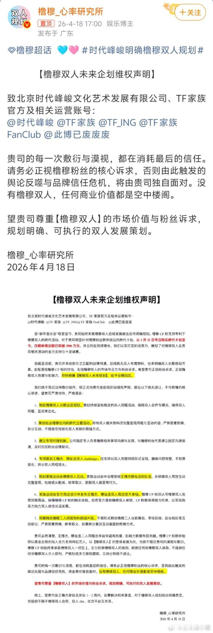 橹穆cp粉维权声明王橹杰和穆祉丞的CP粉“橹穆心率研究所”维权了!4月18日发声明向时代峰峻提了7项诉求,要公司做长期双人规划、专属主题活动,物料不许恶意剪辑,还要专人对接沟通,引发全网讨论