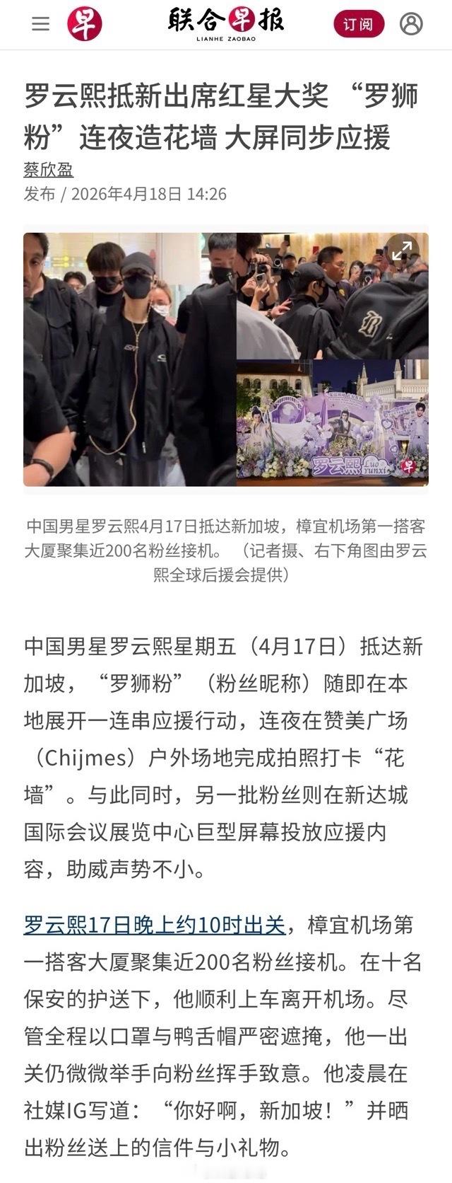 新加坡最大华文报纸《联合早报》头版官宣其行程,评价其为“中国文化在东南亚最成功的符号”;新传媒罕见主动公开航班信息号召接机,娱乐媒体Vibes更直言“罗云熙=新加坡最火中国演员,没有竞争对手”。罗云熙闪耀新加坡