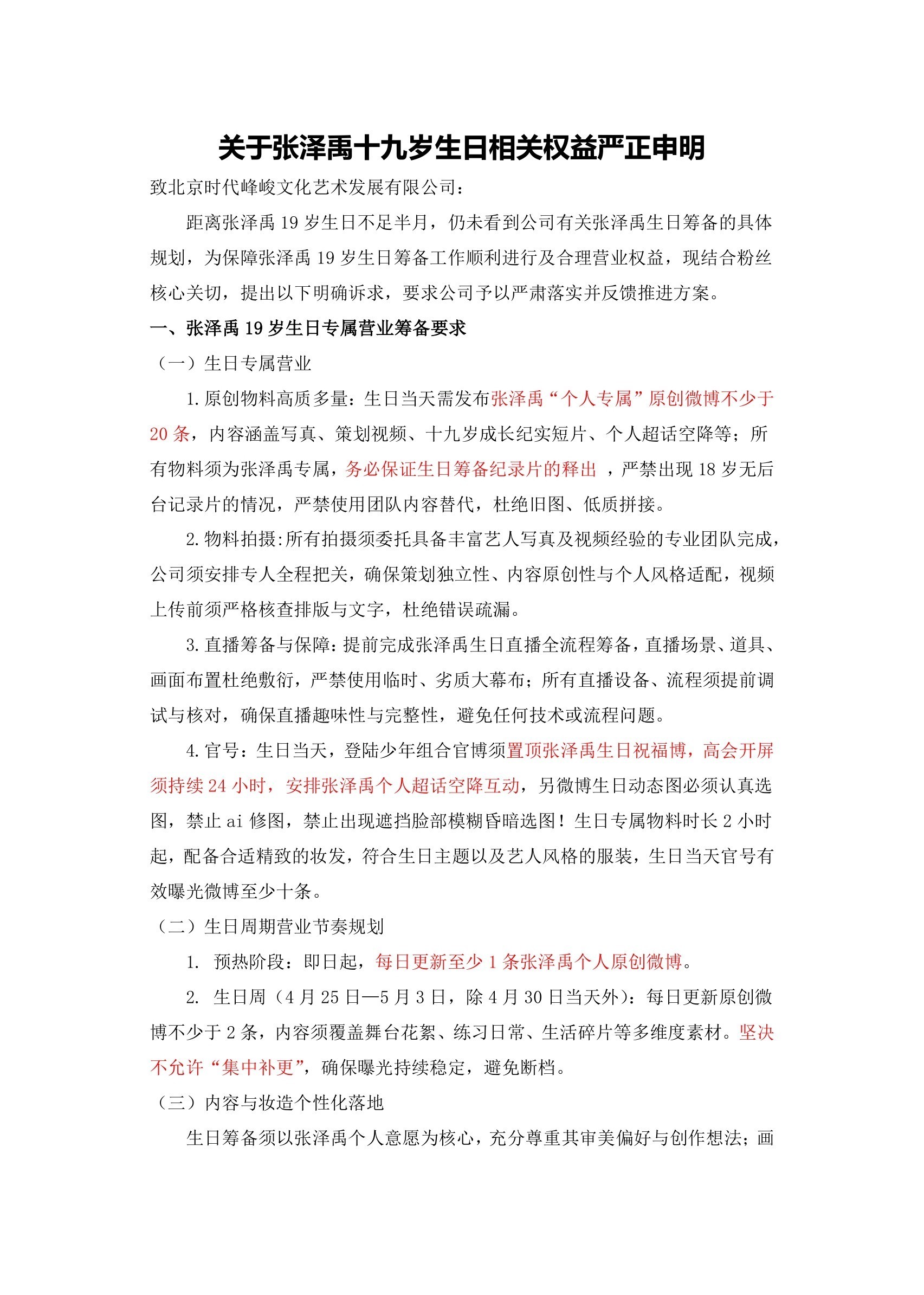 张泽禹生日无预热 张泽禹粉丝发文,4月30日张泽禹即将迎来十九岁生日,但公司目前毫无预热行为也没有任何作为。整个四月只有张泽禹被克扣多条营业博。