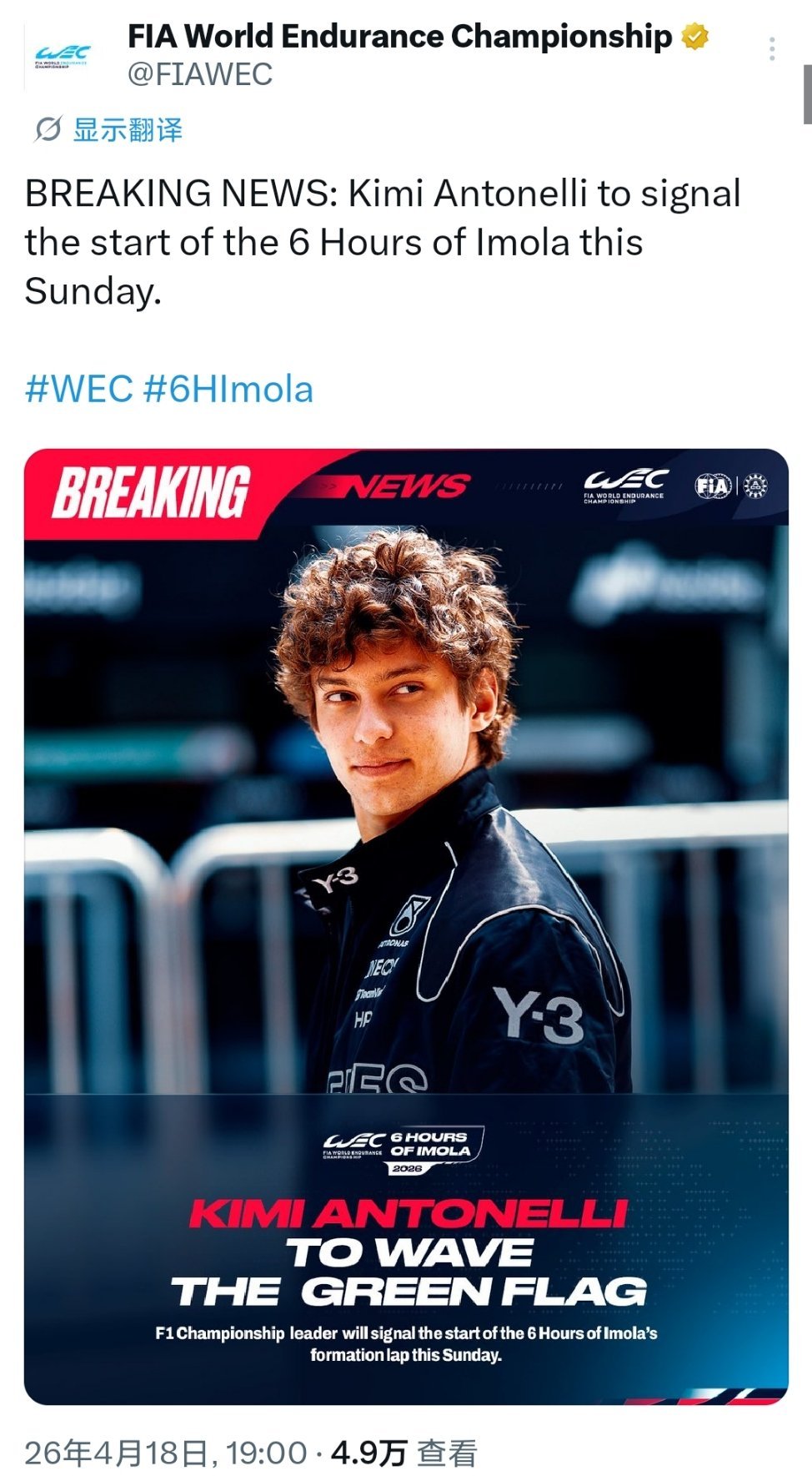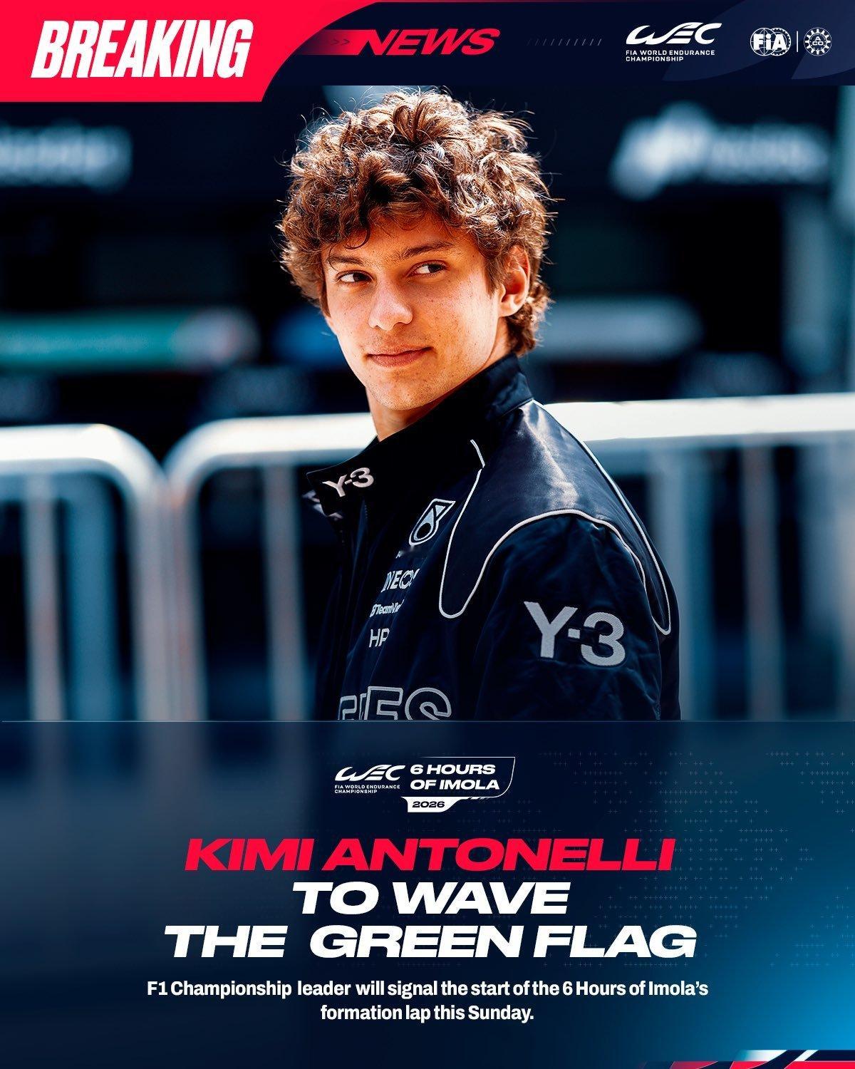 F1车手基米·安东内利 (Kimi Antonelli)将在明日举行的WEC世界耐力锦标赛意大利🇮🇹伊莫拉6小时耐力赛中担任挥旗发车嘉宾👀🏁F1赛车WEC伊莫拉6小时赛