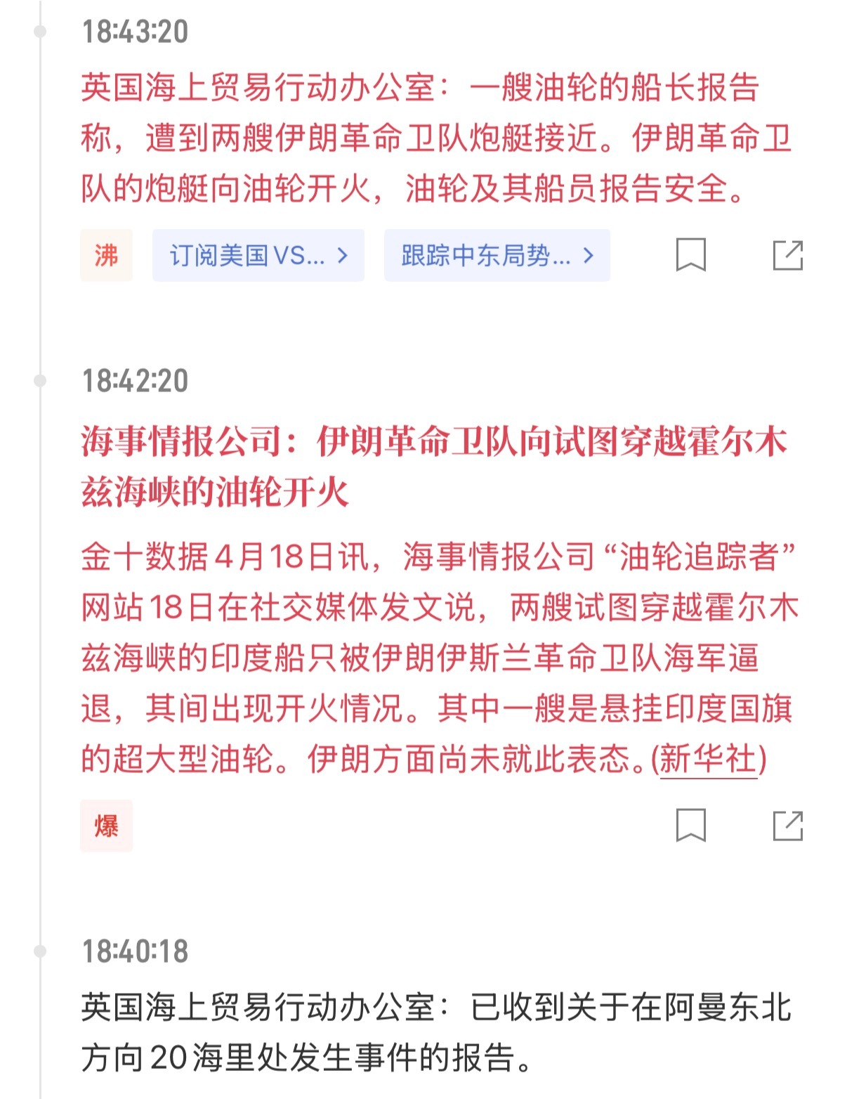 🔻媒体确认:伊朗在霍尔木兹海峡开火。🔻其中一艘是印度船。伊朗恢复对霍尔木兹海峡的控制五一航班大面积取消海外新鲜事五一航班大面积取消